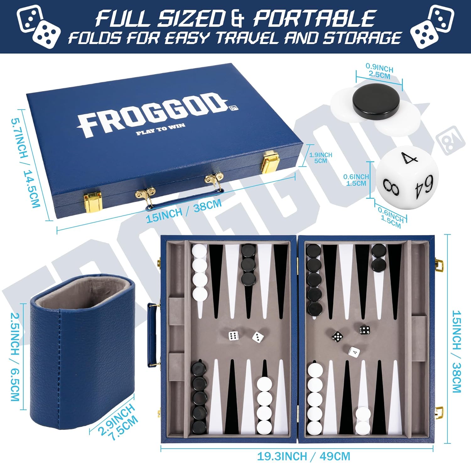 - 【Value-Packed Set】Get your game on with the Froggod Travel Backgammon Set for Adults, featuring a 15-inch PU leather case with seamless flocked game surface, 30 playing pieces, 4 dice, 1 doubling cube, 2 dice shakers, and a instruction manual—everything you need for a classic 2-player match.