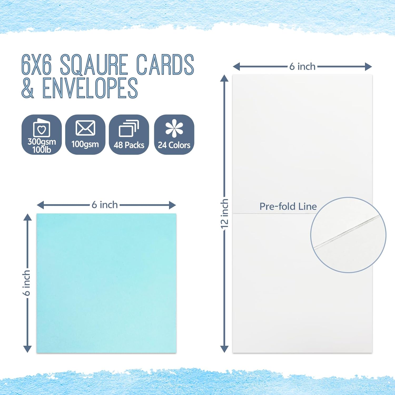- Our Package Comes with 48 PK 100lb Cover (=300gsm) Thick Colorful Cards, (Not 200gsm as Others) And 48PK 100gsm Bright White Envelopes. 6X6 Colorful Cardstock is Pre-Folded. If Cutting in the Middle Will Get 2 Sqaure Cards