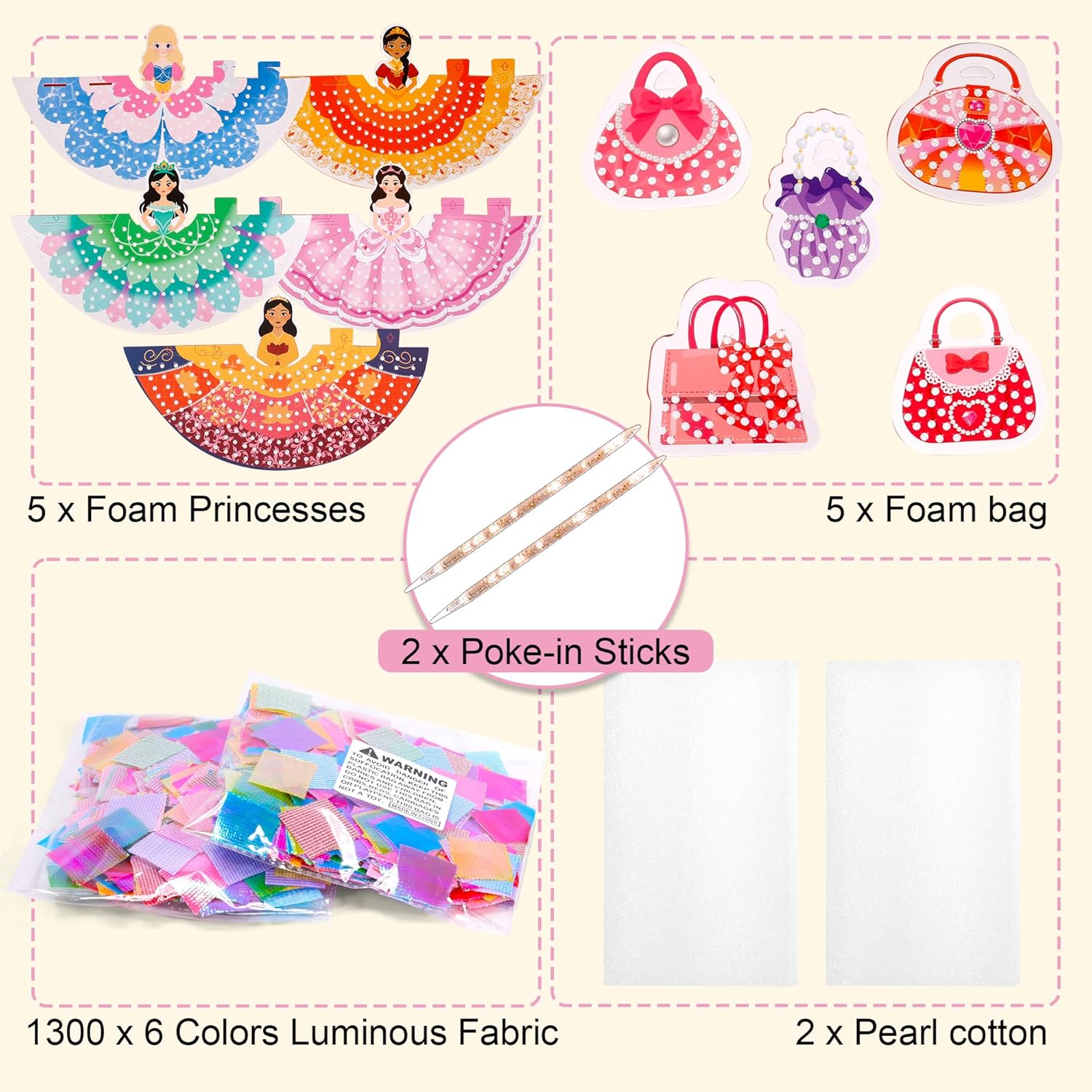 - β¨ Super Easy & So Satisfying: Place, poke, connect and create! Our simple method lets kids craft with ease. Just put a foam princess on the cotton pad, poke the fabric squares in with the poke-in stick, and watch the dazzling gown appear. Connect the pieces β she stands up ready for adventure!
