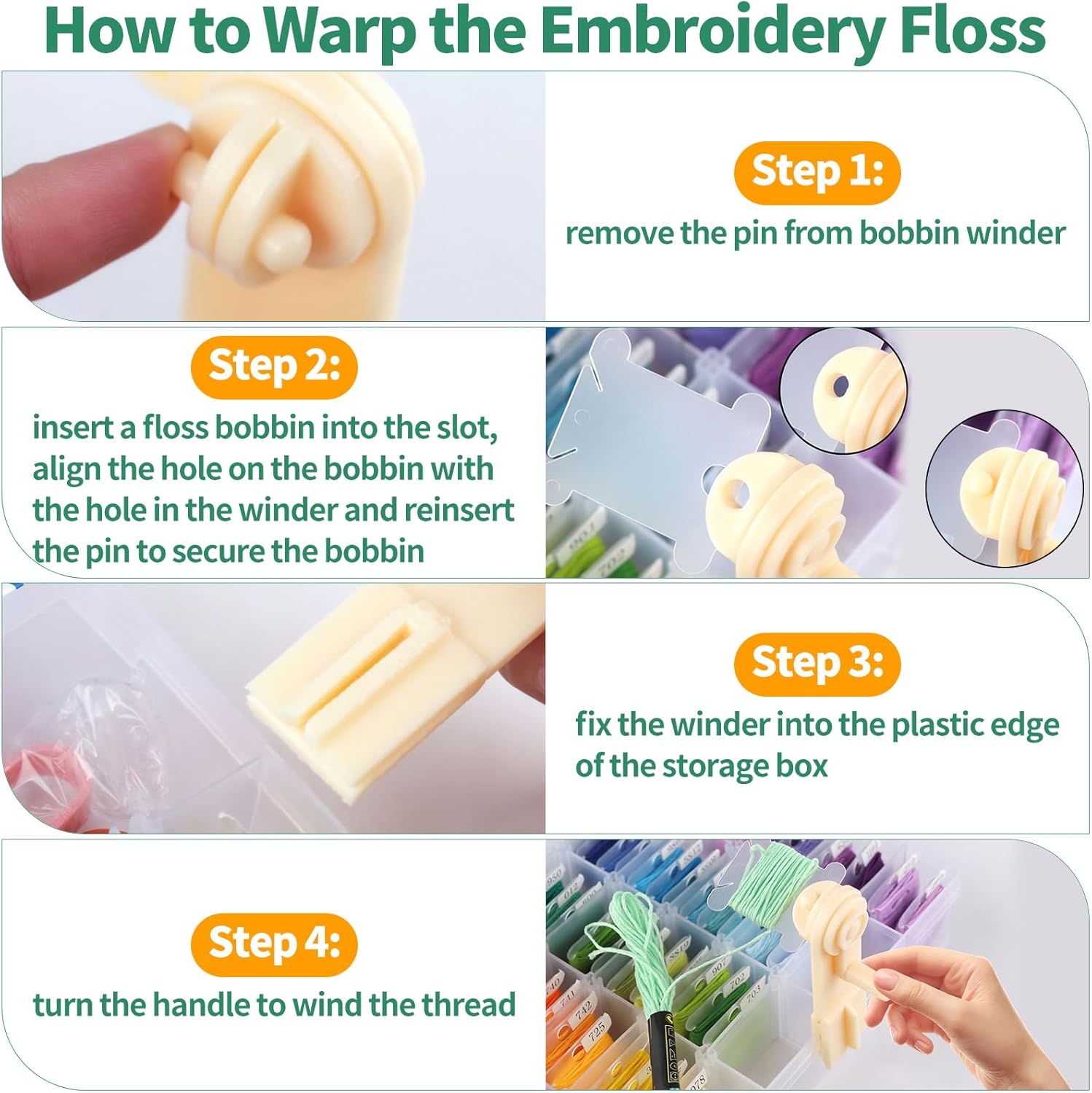 - [Easy to Use] Firstly, remove the pin from floss bobbin winder, fix the spool in the gap of the fixing plate, align it with the hole, insert the plastic pin of the floss bobbin winder to hold the bobbin, then perch the bobbin winder upright on the edges of a standard plastic bobbin box and turn the handle to wrap the threads. The variety of colors helps you better sort your coil, good time saver for your working