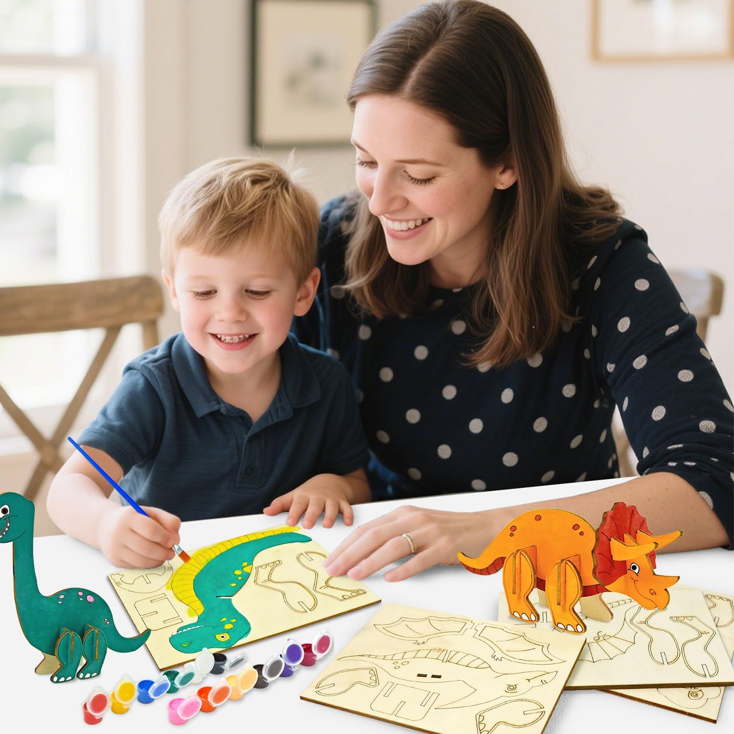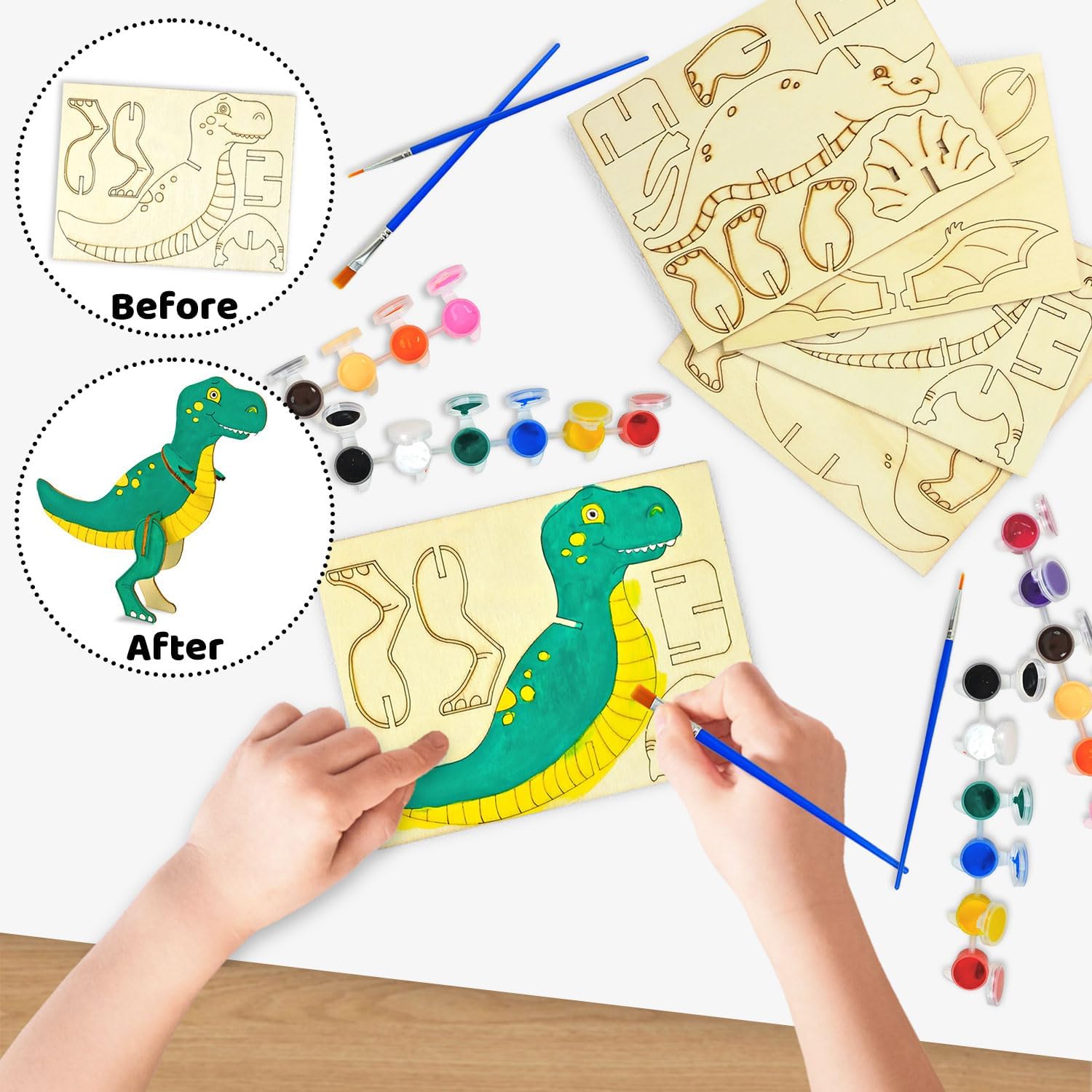 - Fun Crafts for Kids: This all-in-one dinosaur crafts set includes 6 wooden 3D dinosaur puzzles, 4 stripes of paints (24 painting pots), and 4 brushes -perfect for kids who love arts and crafts. Build, paint, and play while developing fine motor skills and creativity