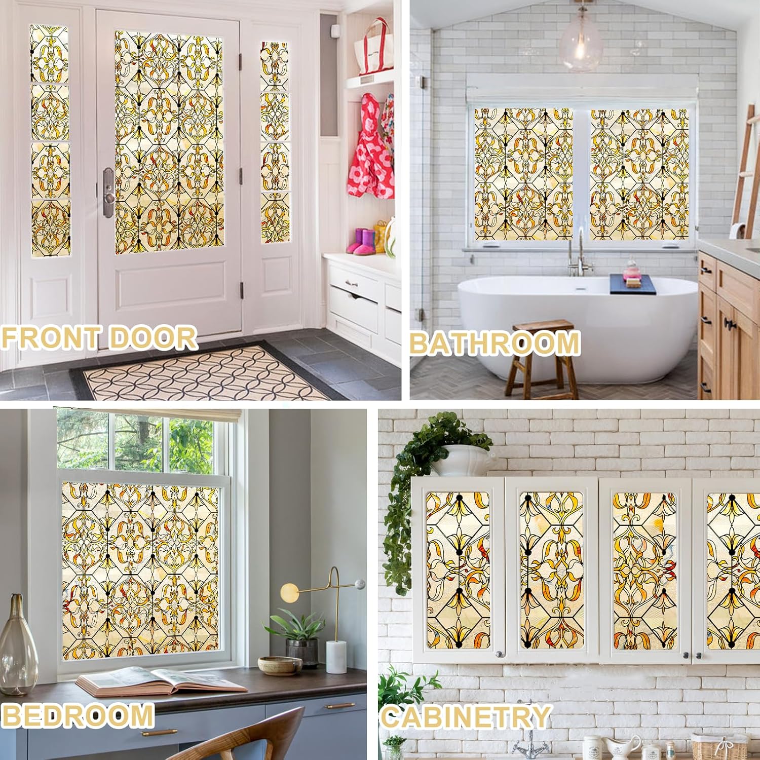 - GiltGaze Luxury Design-OHTMERU Stained Glass Window Privacy Film combines elegance and luxury where delicate golden patterns intertwine to create a sense of refined opulence. Its 3D effect mimics real stained glass and enhances the luxury of your living space.