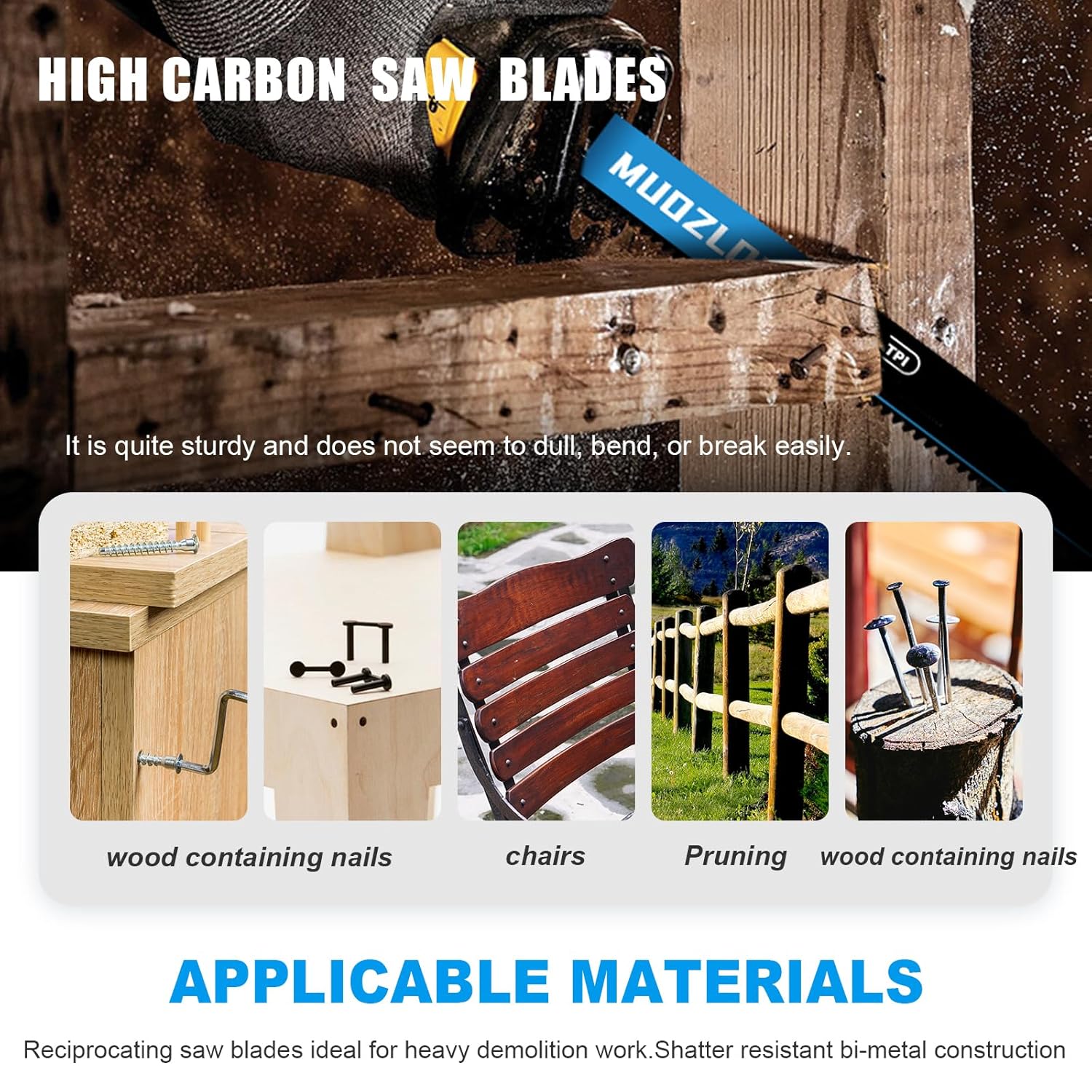 - Multifunctional: 6TPI reciprocating saw blades provide superior cutting performance at both wood and nail-embedded wood, when we trim wood containing nails such as abandoned fences, no longer have to worry about nail damage to the saw blade or frequently replace different kinds of reciprocating saw blades