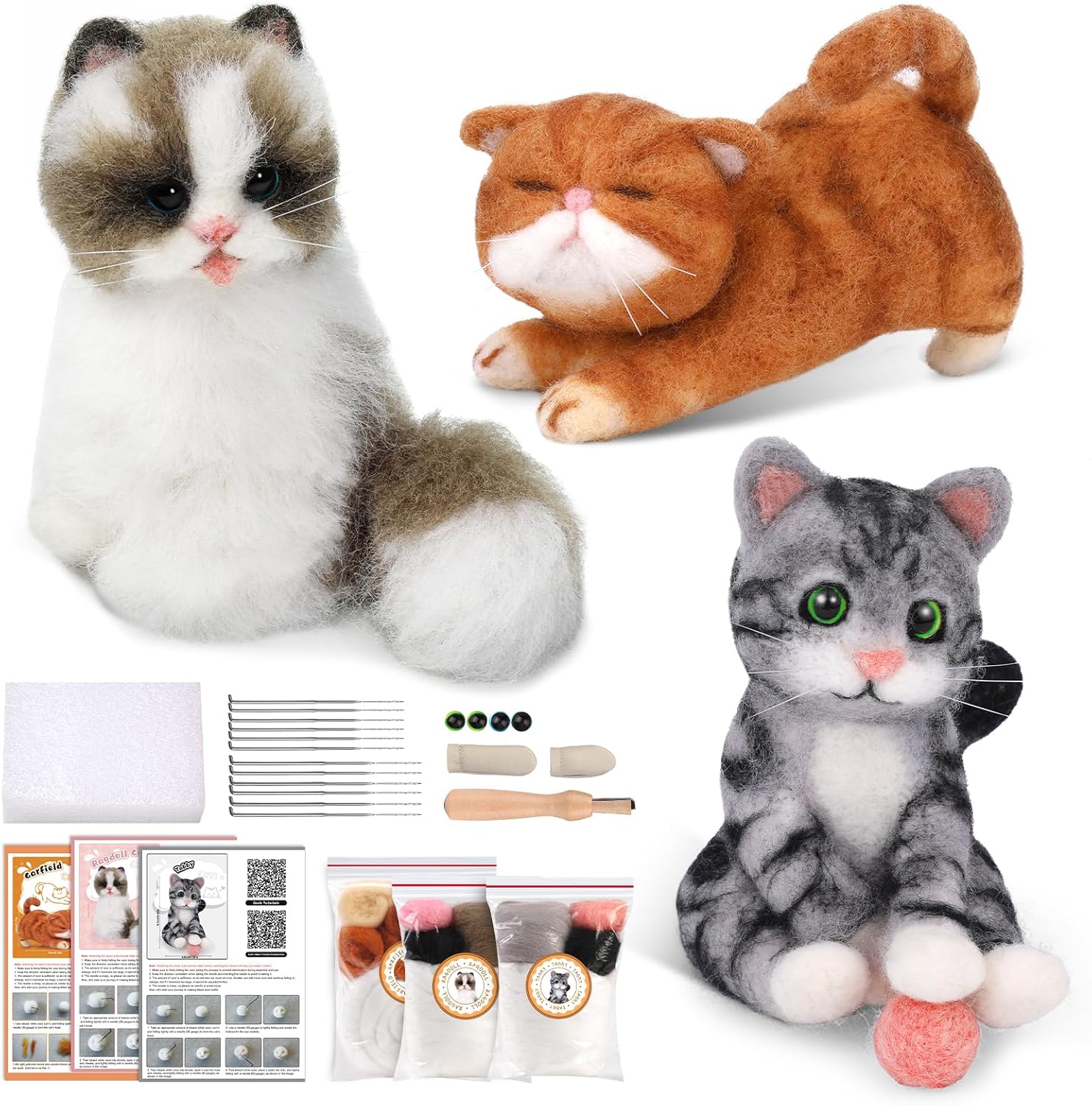 - Needle Felt Starter Kit: You will receive 3pcs cat making material bag, 12 pcs felting needles, 1 pair finger cot, 1 pcs wooden felting tool, 1 pcs felting mat,1 pcs needle bottles and it can be a cute DIY craft set for your friend who likes the wool needle felting