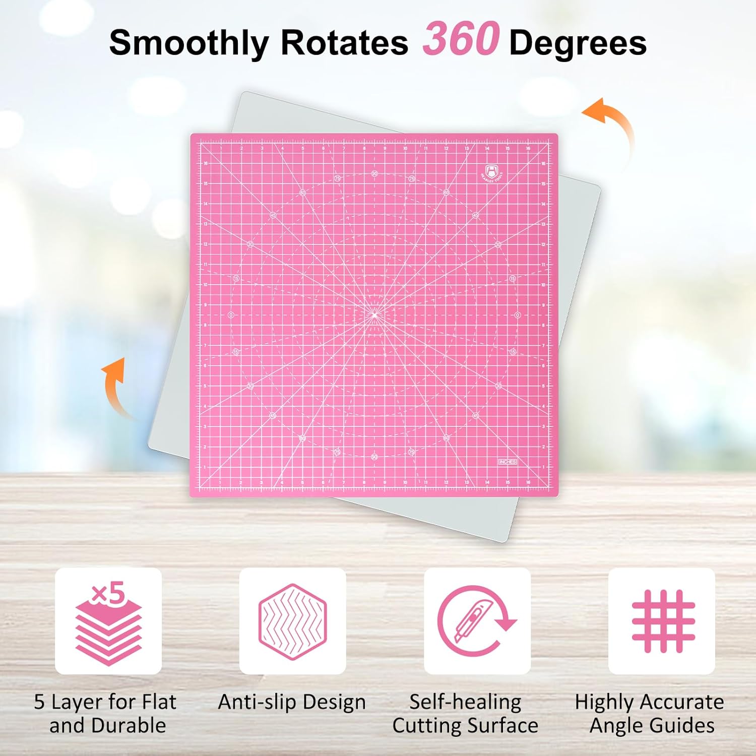 Headley Tools 17"x17" Rotating Cutting Mat, Self Healing Mat with 360-Degree Rotation & Anti-Slip Base, Sewing Board Cutting Mat Perfect for Fabric Quilting Leather Hobby Project, Pink