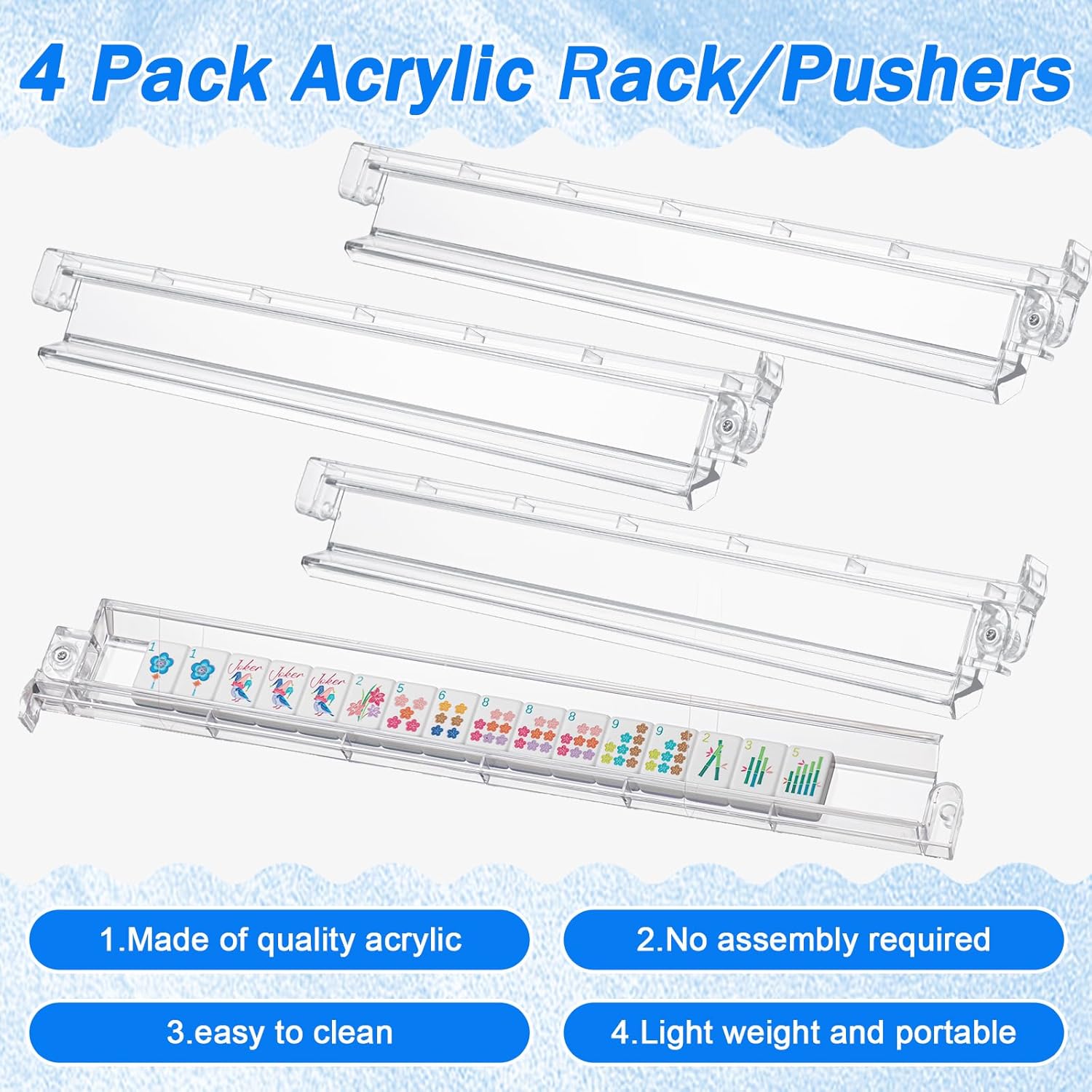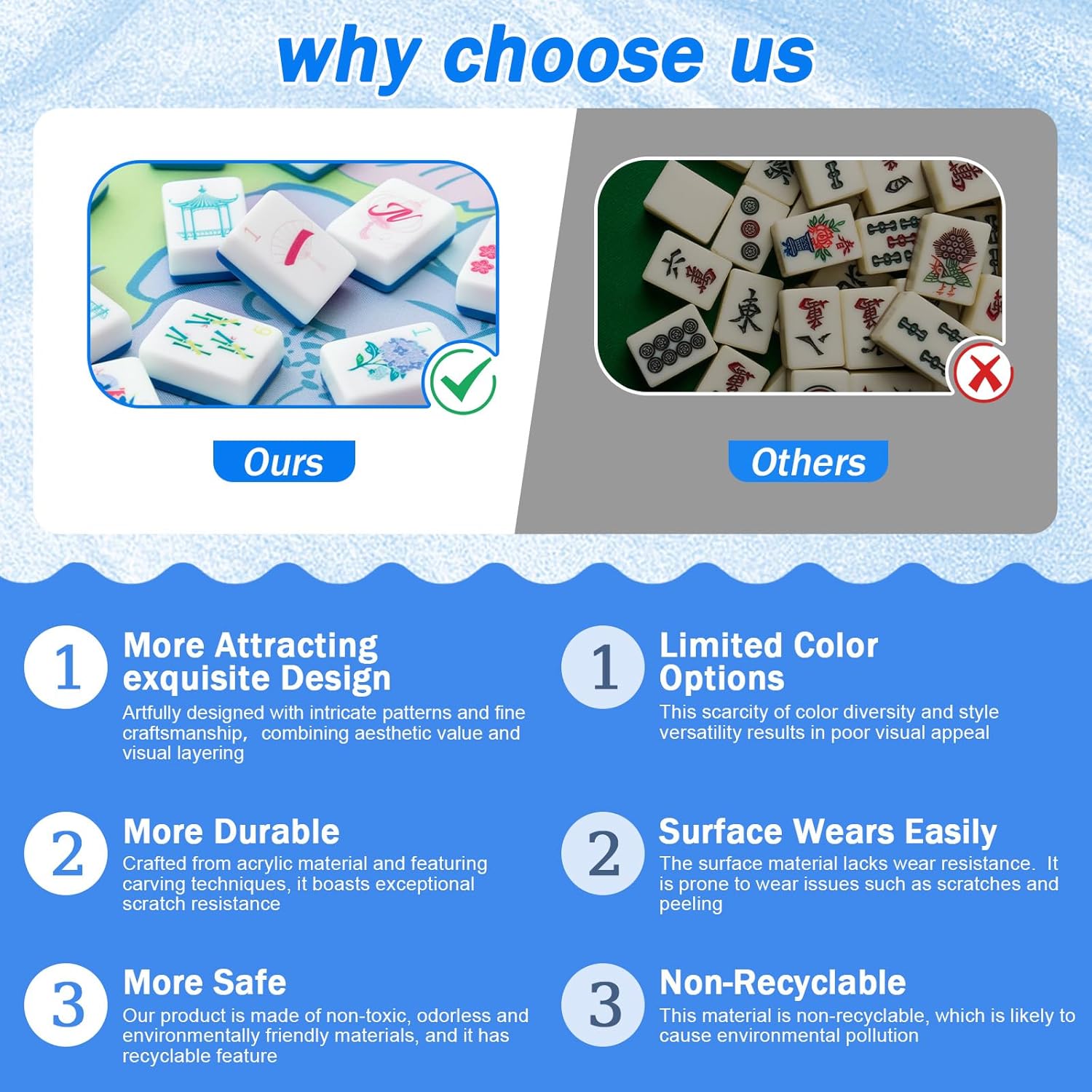 - Premium Acrylic Material: These Mahjong tiles and pushers are crafted from high-quality acrylic, known for its scratch-resistant and durable properties. The white acrylic surface prevents yellowing, maintaining its superior appearance over time. The engraved patterns won't fade, ensuring you enjoy clear, beautiful characters and designs for a lasting gaming experience