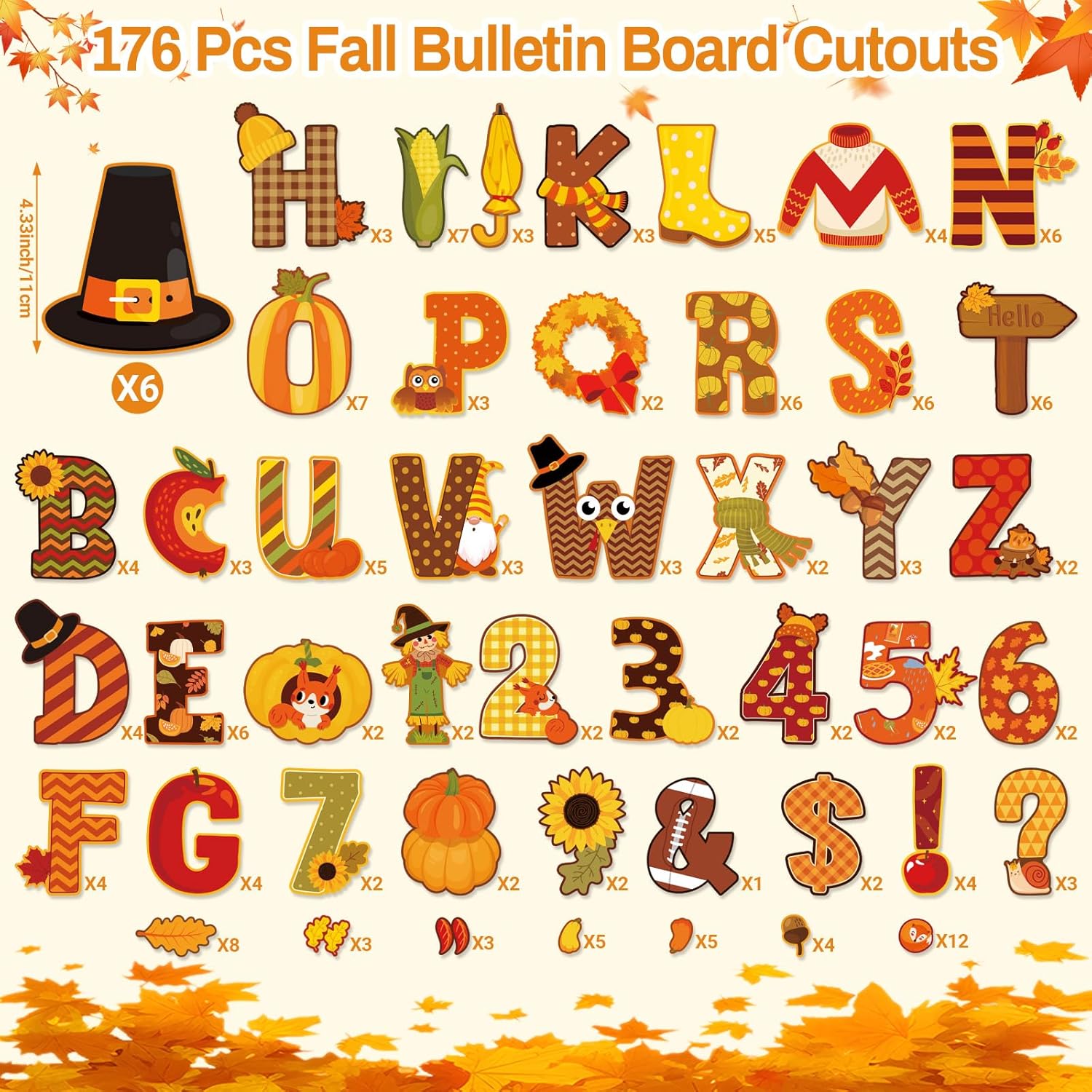 - Bulletin Board Letters Combo Set: you will receive 176 pcs fall letters, numbers and punctuation cutouts including 110 letters cutouts, 20 number accents cutouts and 46 punctuation marks; Sufficient quantities and various patterns will meet your different decoration needs for classroom, home, office, which will create a warm and vibrant fall atmosphere