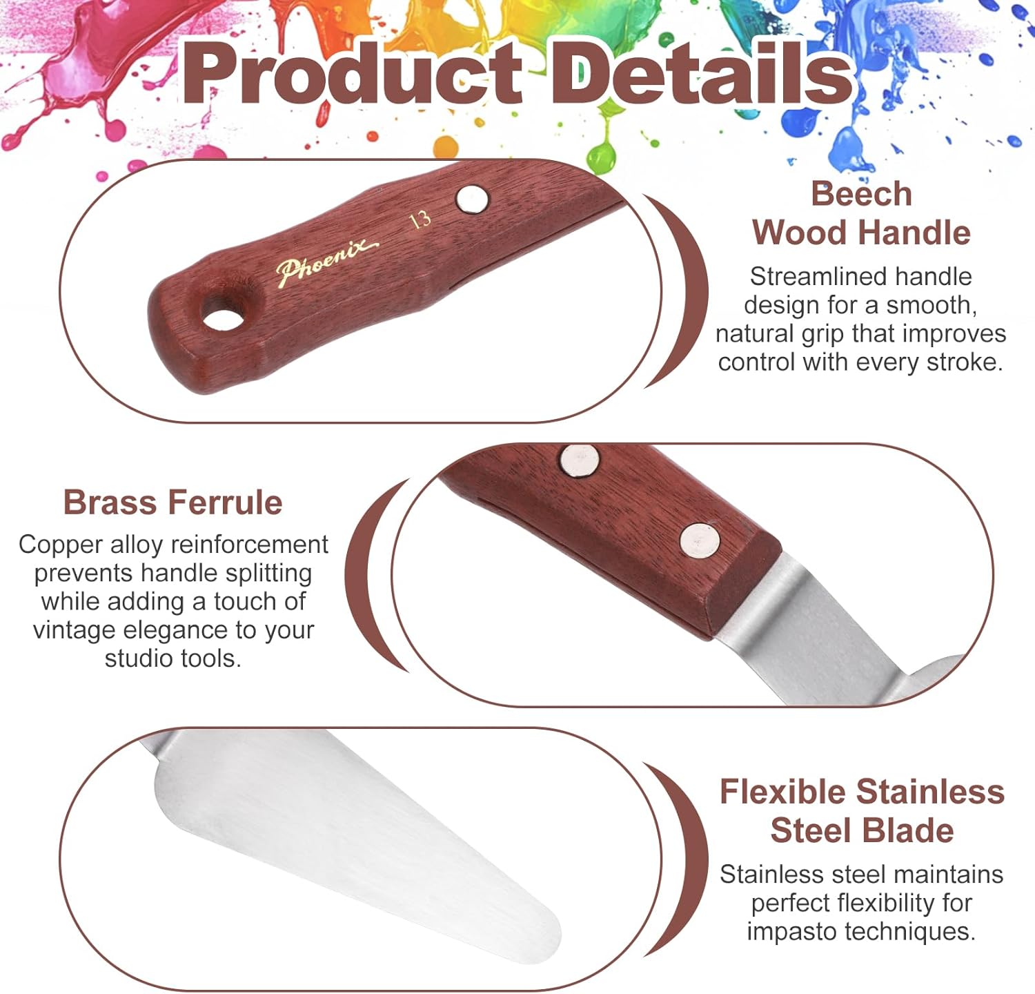 - Painting Knife, Total Length: 27cm/10.63 inch; Knife Size:120x50mm/4.72x1.97inch(L*W); Model No.: No.13; Style: Square-Ended Handle with Base Hole; Knife Material: Stainless Steel; Handle Material: Beech Wood; Handle Color: Mahogany Finish; Package Contents: 1 Pcs x Palette Knife
