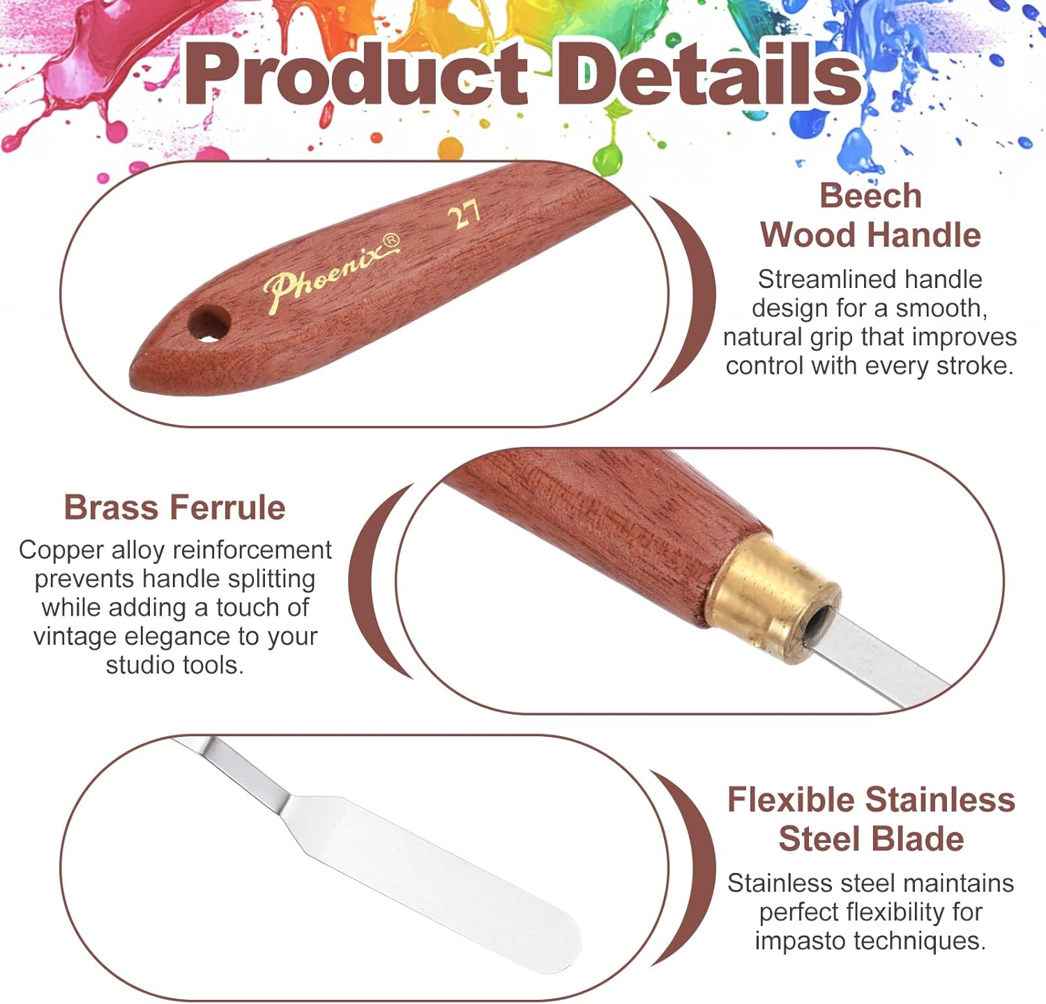 - Painting Knife, Total Length: 21cm/8.27 inch; Knife Size:64x13mm/2.52x0.51inch(L*W); Model No.: No.27; Style: Pointed Handle with Notched Base & Hanging Hole; Knife Material: Stainless Steel; Handle Material: Beech Wood; Handle Color: Mahogany Finish; Package Contents: 1 Pcs x Palette Knife