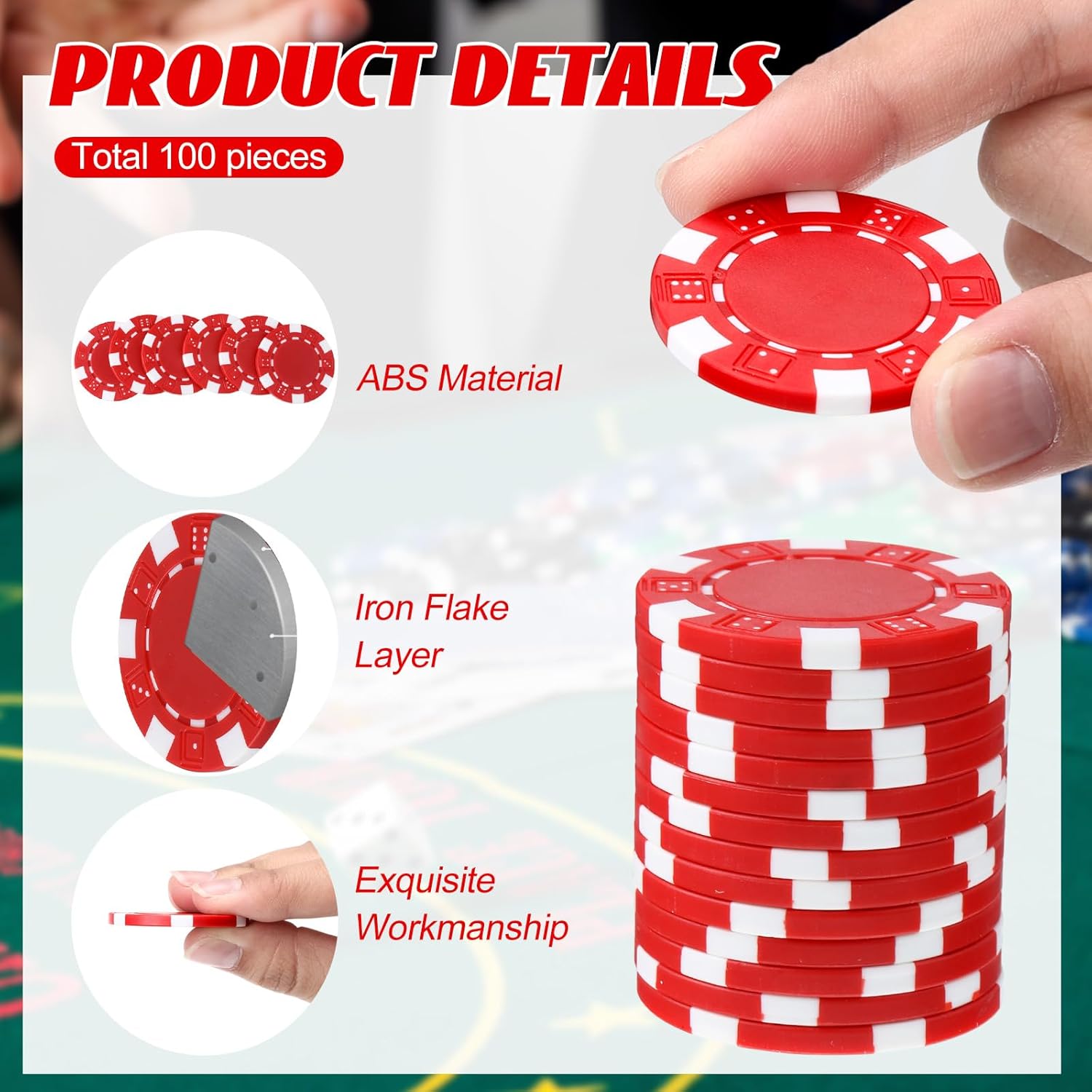 - Durable Material: Crafted from reliable ABS material, these poker chips are designed to withstand regular use during gaming sessions. The sturdy construction ensures that the chips resist wear and tear, maintaining their appearance and functionality over time