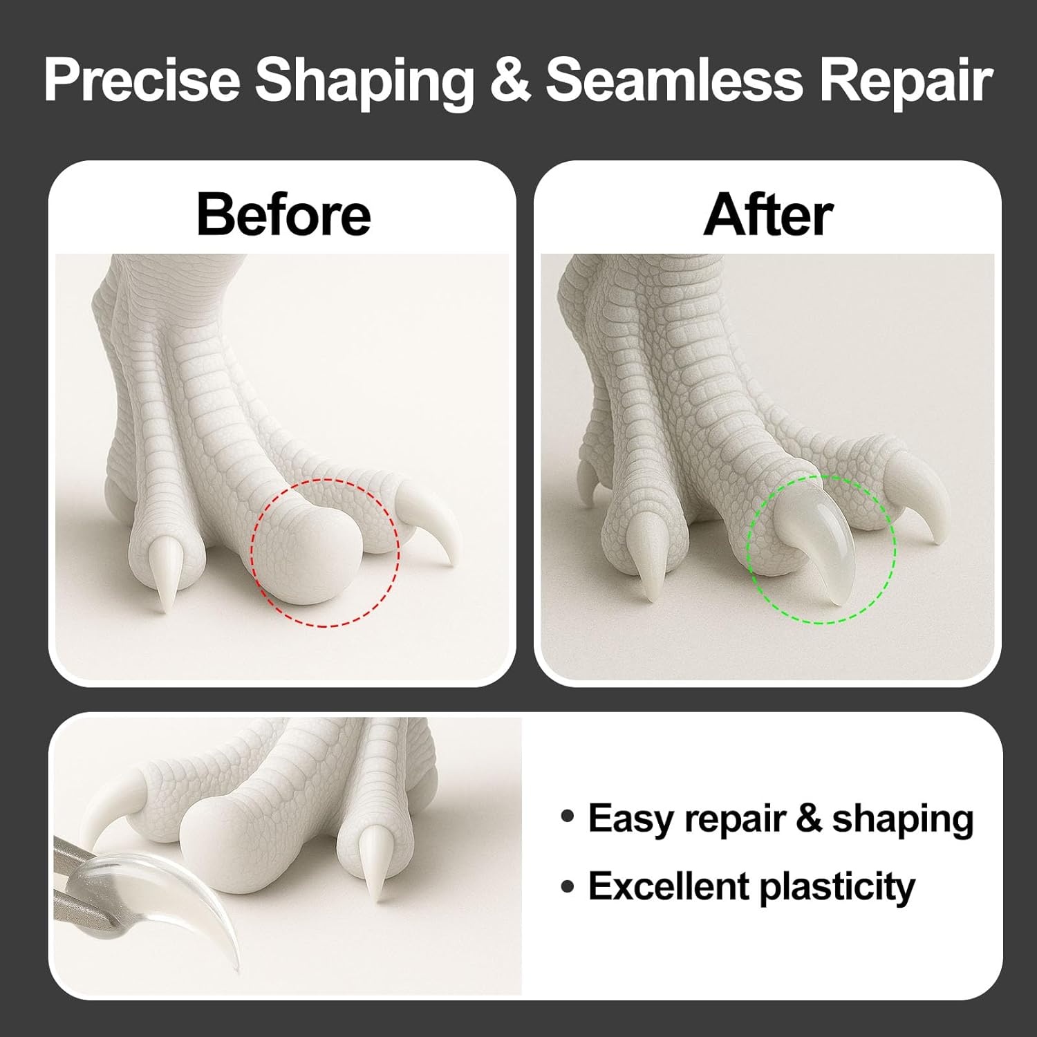 - Strong Adhesion & Sandable Surfaces: UV light curing putty bonds securely to a variety of surfaces. Once cured, UV clay can be easily sanded to a smooth, professional, paintable finish for seamless restorations or intricate sculptural details