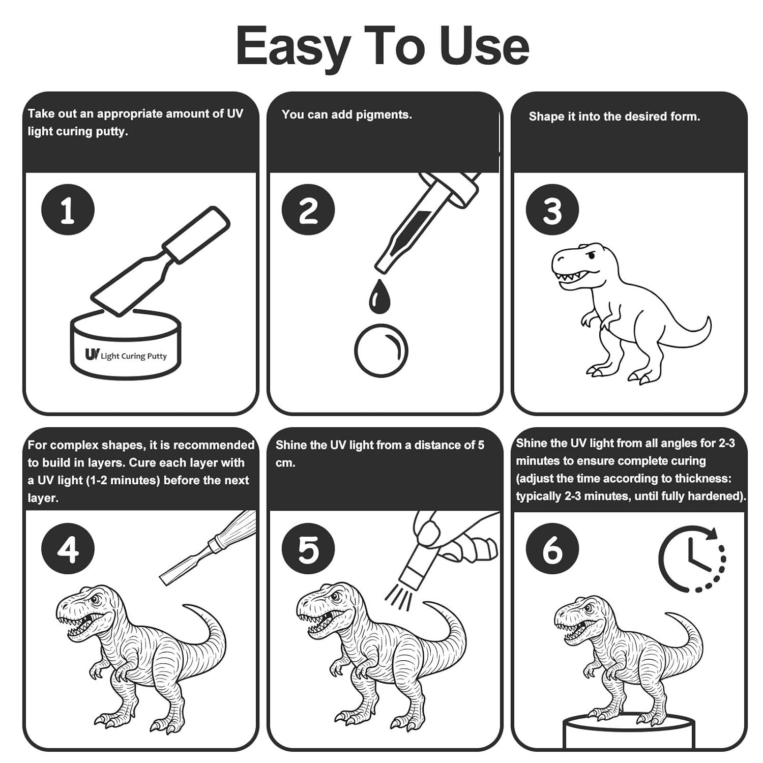 - Easy To Use: Just take out the required size of light curing putty, add color to shape (or fill gaps), and use UV light for 2-3 minutes until hardened. Whether you are repairing or making crafts, UV light curing putty can meet your needs