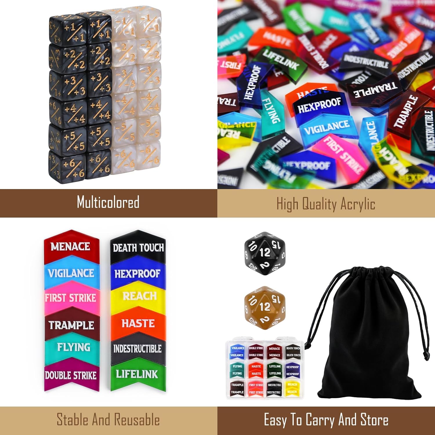- PACKAGE INCLUDED - Comes with 60pcs MTG tokens & 62pcs MTG dice set. MTG tokens include 5x First Strike, 5x Double Strike, 5x Indestructible, 5x Hexproof, 5x Haste, 5x Reach, 5x Lifelink, 5x Deathtouch, 5x Menace, 5x Trample, 5x Flying, 5x Vigilance. Dices include 60pcs D6 dice and 2pcs D20 dice. Note: Product includes tokens and dices only.