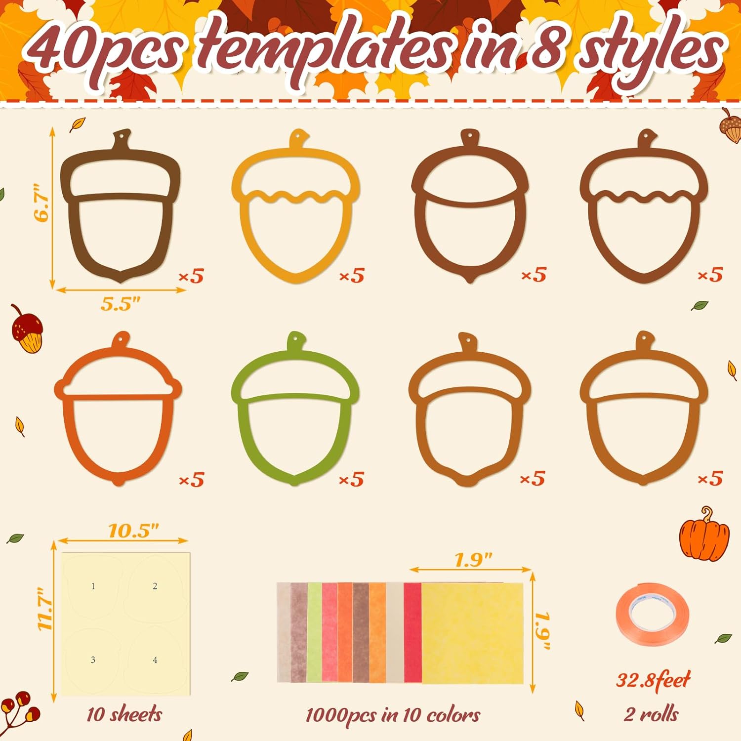- Fall Craft Kit: 40-Piece Bulk in one set. Includes 40 pre-cut acorn frames (8 designs), 1000 tissue paper squares (1.96*1.96inches, 10 vibrant colors), 40 transparent adhesive pieces, and 2 rolls of ribbon(orange, 32.8feet each), and instructions. Great for large groups, classrooms, or Thanksgiving events