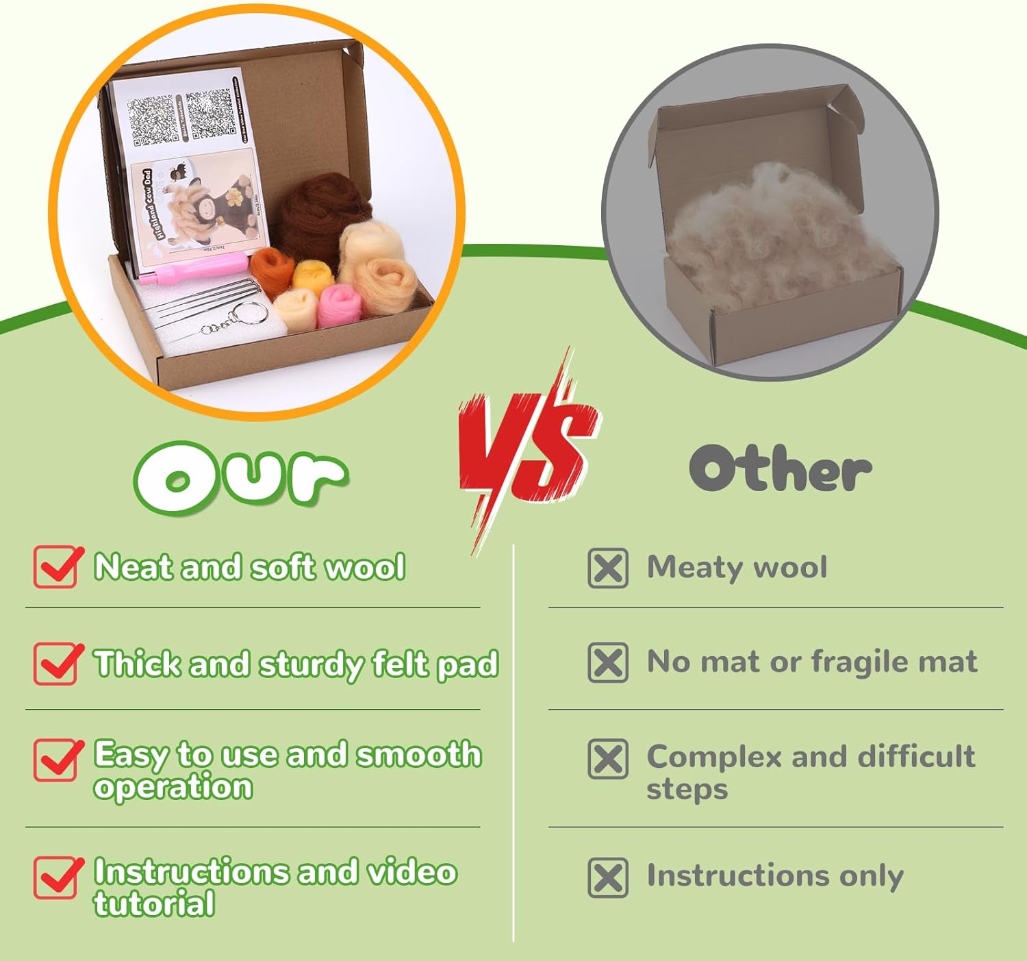 - Wool Felting Starter Kit: The wool felting set includes the amount of wool needed for the projects, a needle felting pad, instructions, finger cots, and a wooden felt handle. We also offer 2 models of felting needles to meet your felting needle needs