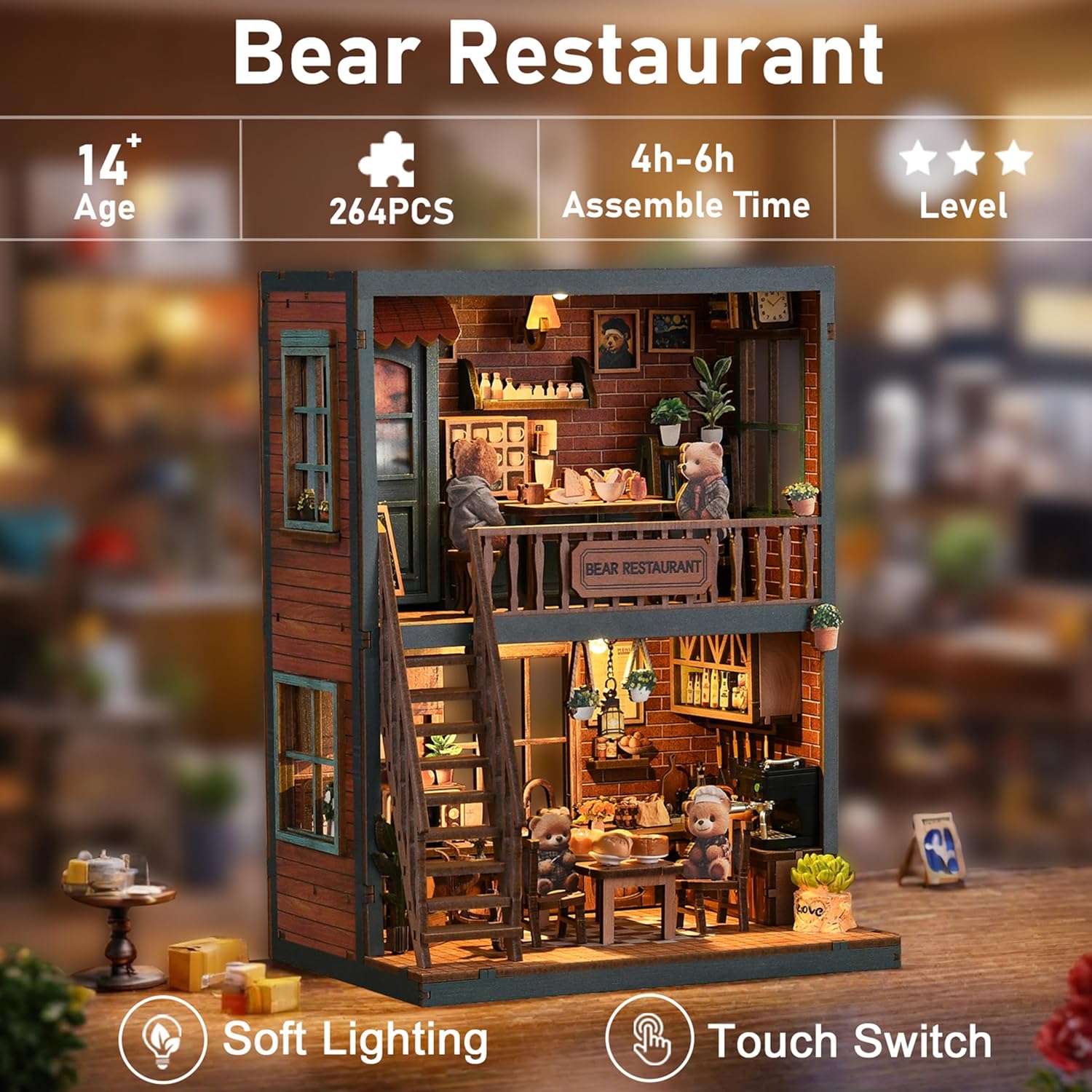 ISSEVE Book Nook Kit - DIY Miniature House Kit for Adults, Teens and Beginners, Dollhouse Booknook Craft Tiny House Bookshelf Decor 3D Wooden Puzzle, Gifts for Friends Family (Bear Restaurant)