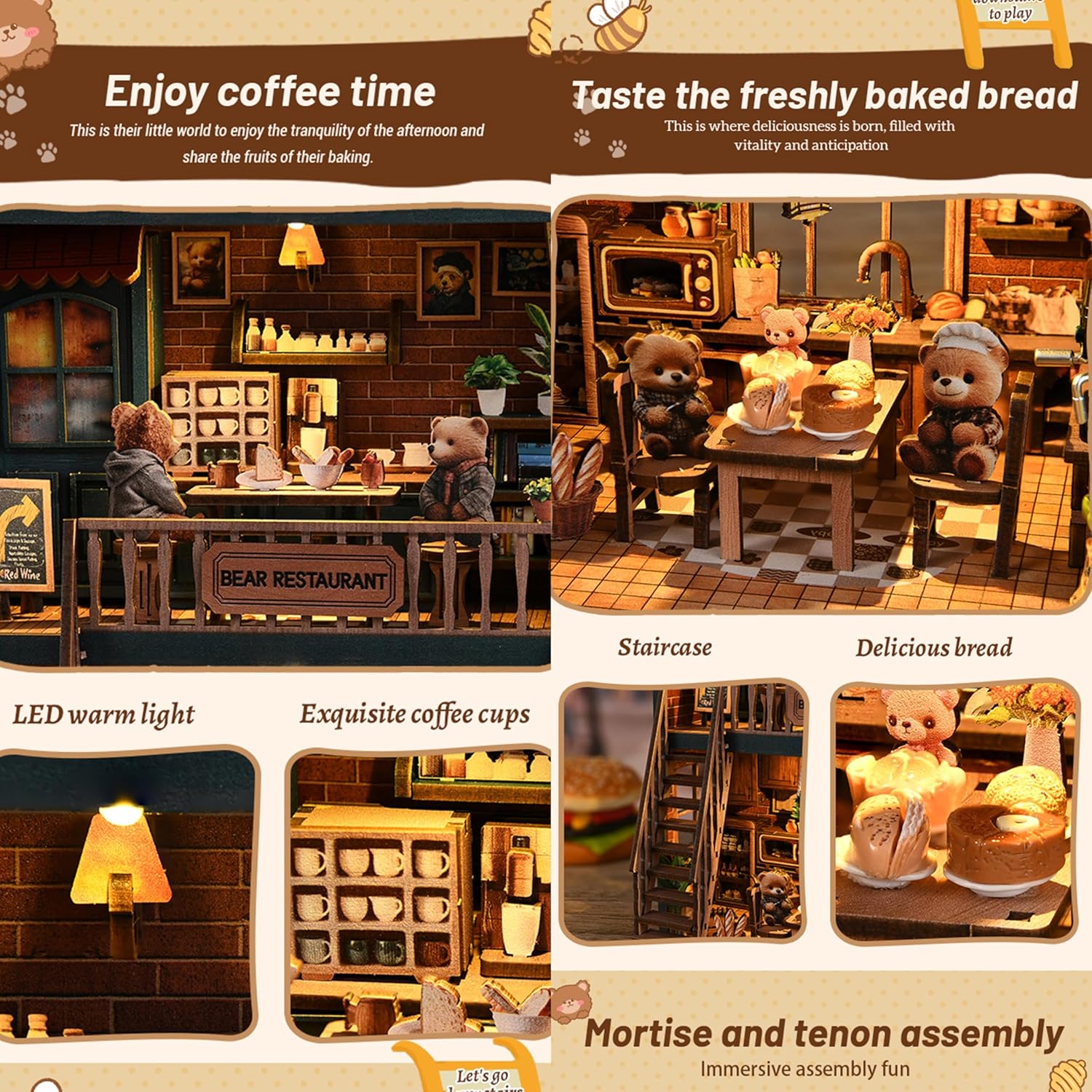 - 【Bear Restaurant Book Nook Kit】Bear restaurant theme book nook it truly recreates the adorable little bear's baking life, inviting you to enjoy a sweet "foodie" time together. This miniature house kit with two-story structure design,the upper floor is a leisurely coffee corner and the lower floor is a busy bakery-this single house holds all the sweetness time