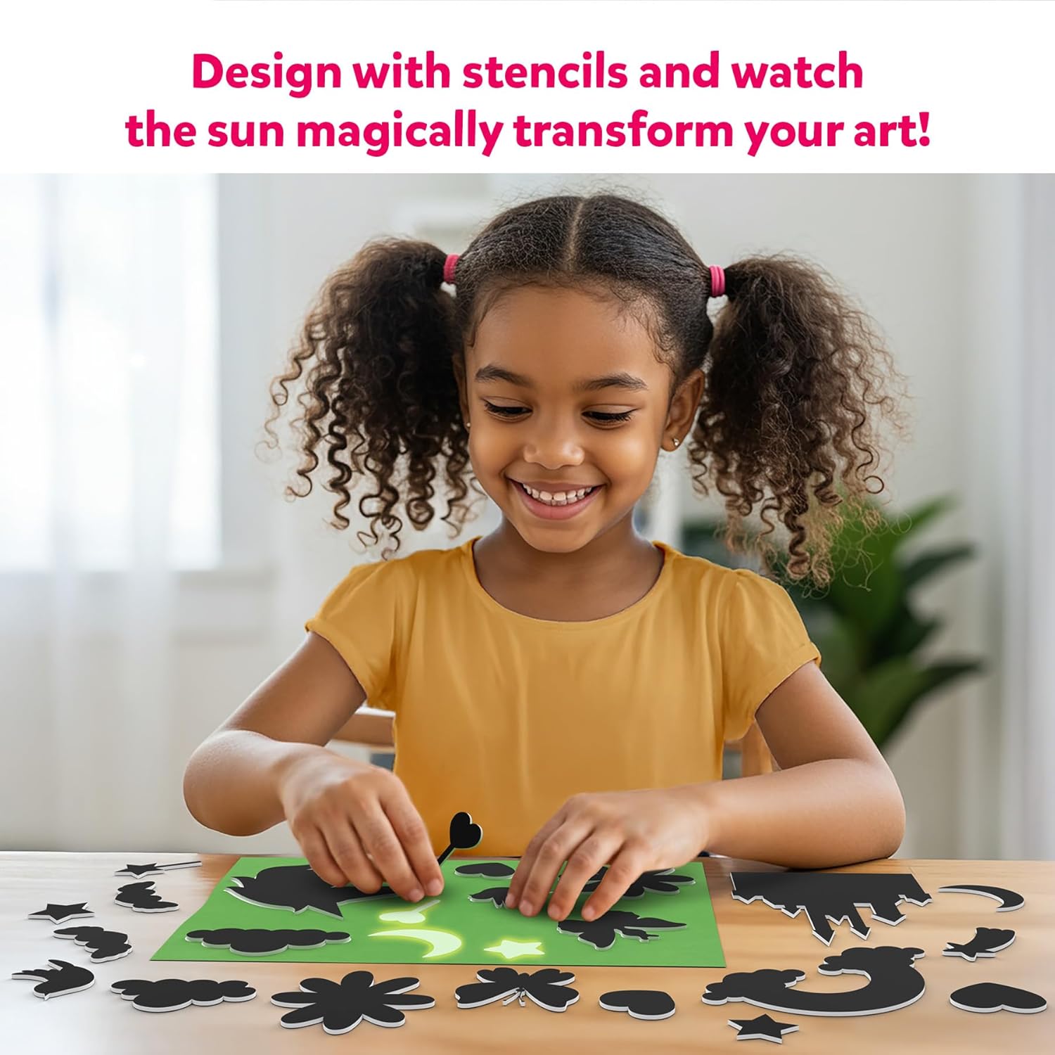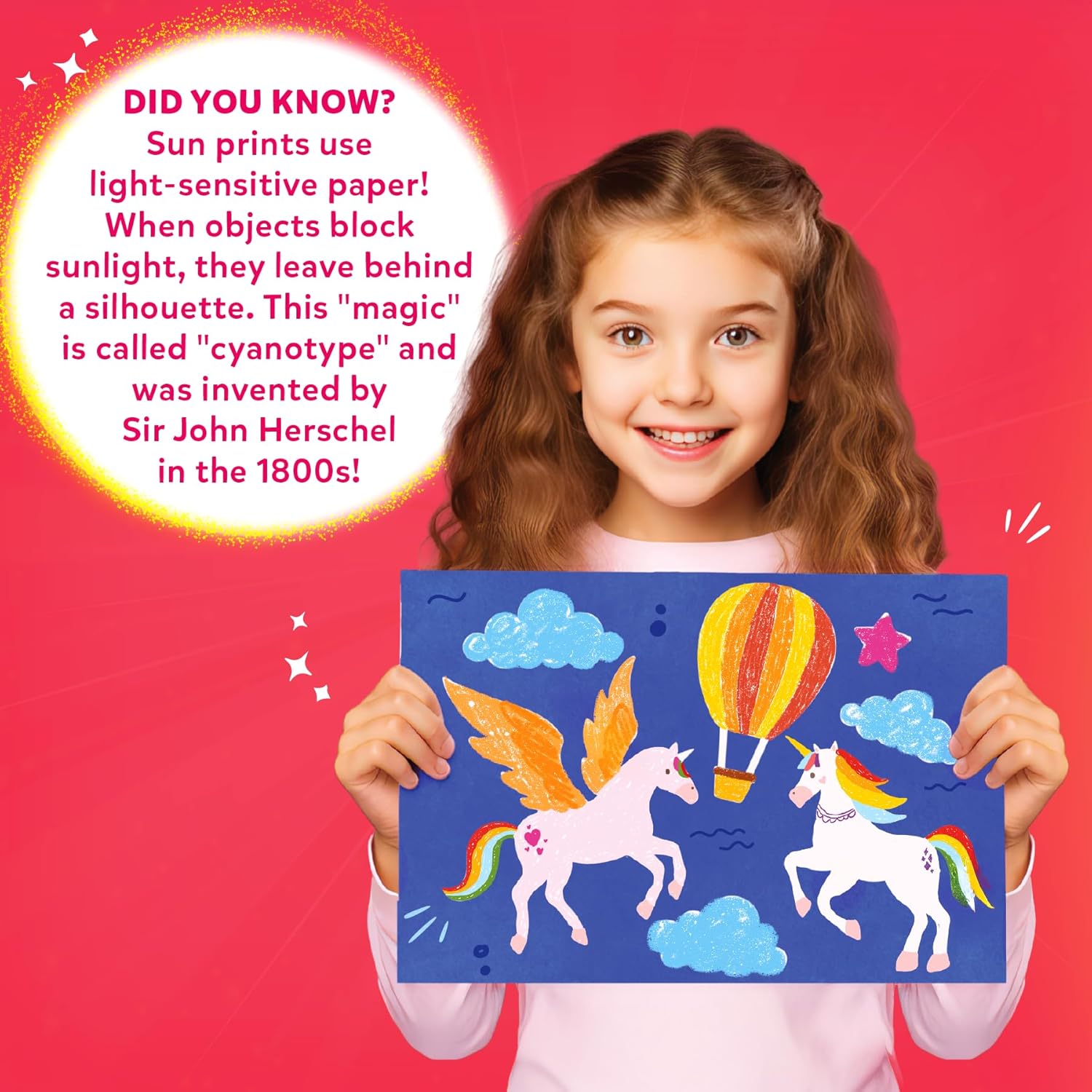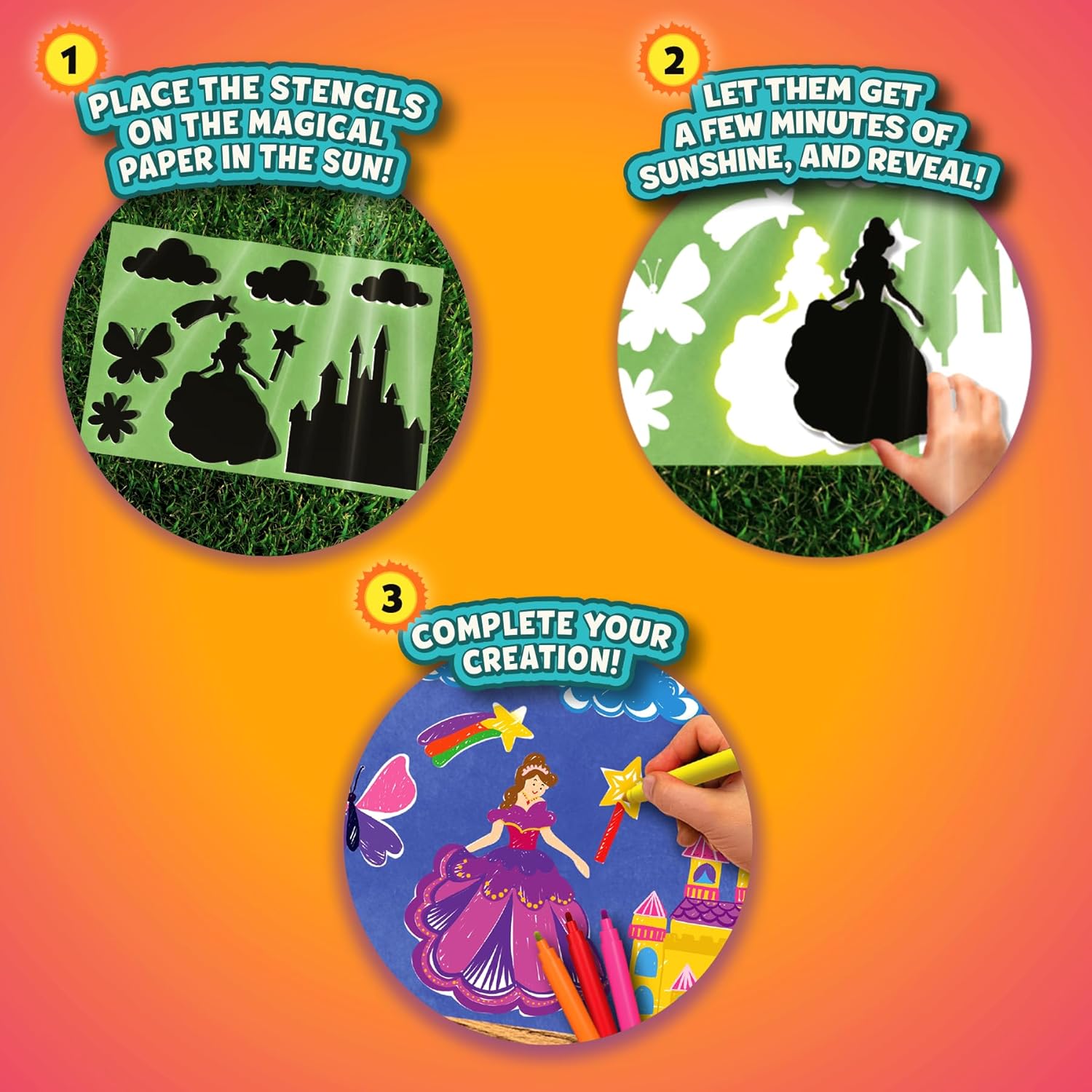 - MAGICAL SUN PAPER ART KIT: Spark creativity with this science-powered fantasy craft! Arrange unicorn and princess-themed stencils on sun paper, let the sunlight work its magic for 10 minutes, and watch enchanting silhouettes appear. Dip the paper in water to enhance the effect, let it dry, then decorate with markers for a majestic masterpiece!