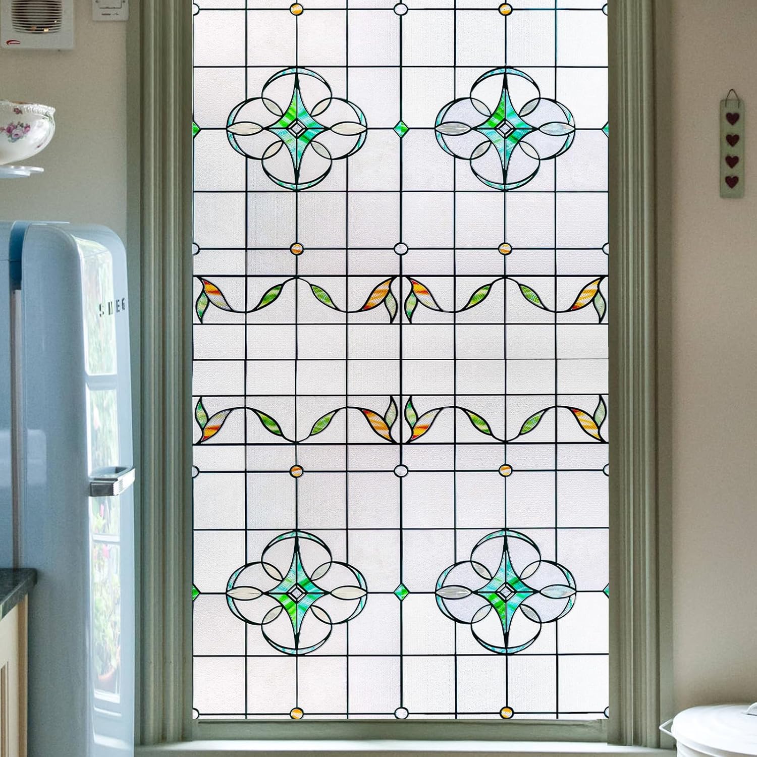 - Verdant Whimsical Symmetry-The Verdant Whispers OHTMERU Stained Glass Window Privacy Film features symmetrical geometric motifs with verdant greens and warm amber-hued leaves, crafted in a stained-glass style. Its delicate, nature-inspired design brings a whimsical, tranquil charm to spaces, transforming windows into a serene artistic centerpiece.