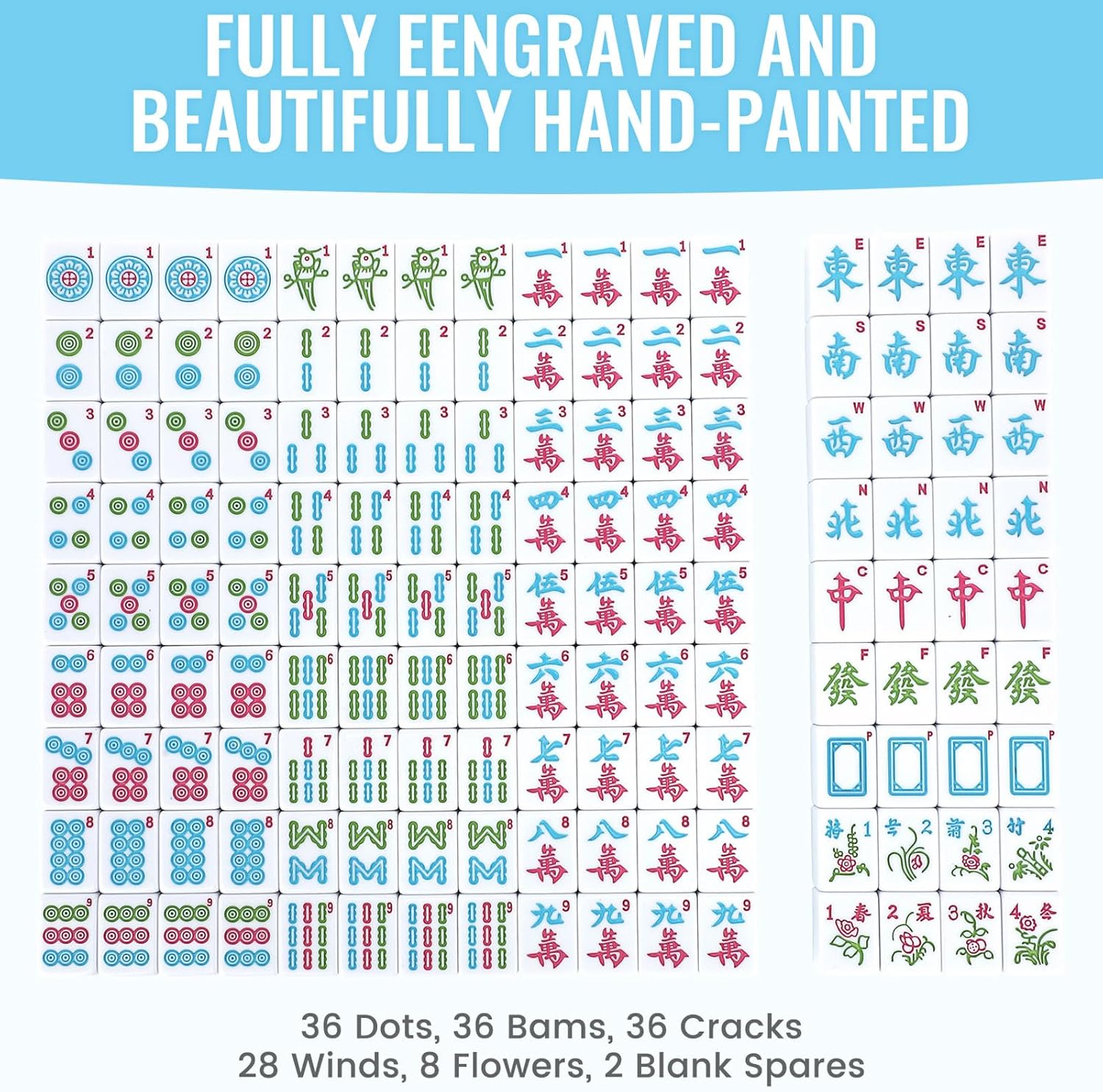 - 【Mahjong Tile Design】 Set Includes 146 Tiles (36 Circles, 36 Bamboos, 36 Characters, 12 Dragons, 16 Winds, 8 Flowers And Seasons) With Chinese Characters Engraved Clearly.