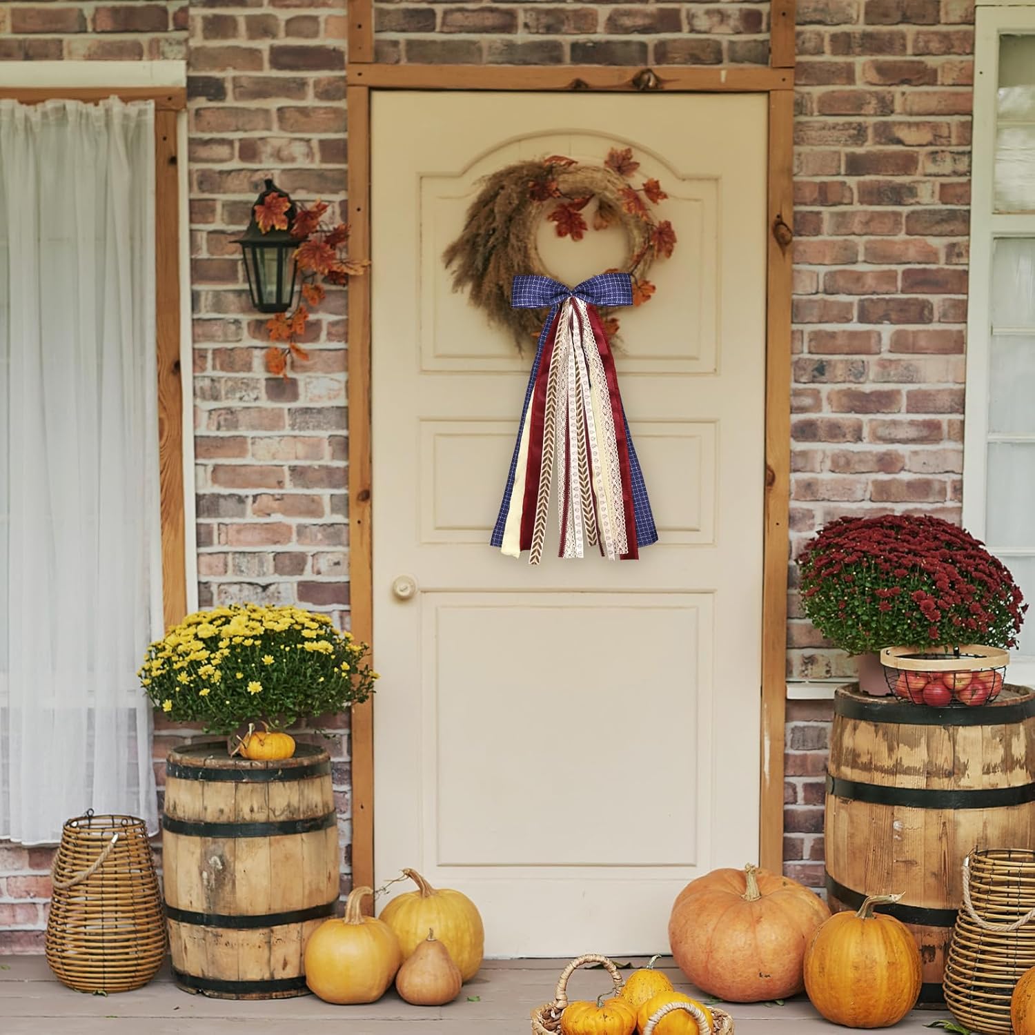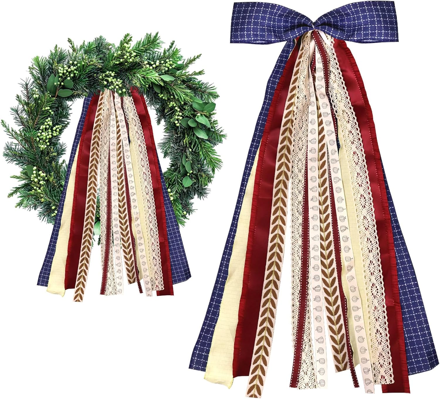 Large Blue Buffalo Plaid Ribbons Bow for Wreath, Red Orange Fall Fabric Ribbons Set Assorted Lace Ribbon Navy Clip-On Wreath Sash Ribbon Bundle for Thanksgiving Home Indoor Outdoor Decor