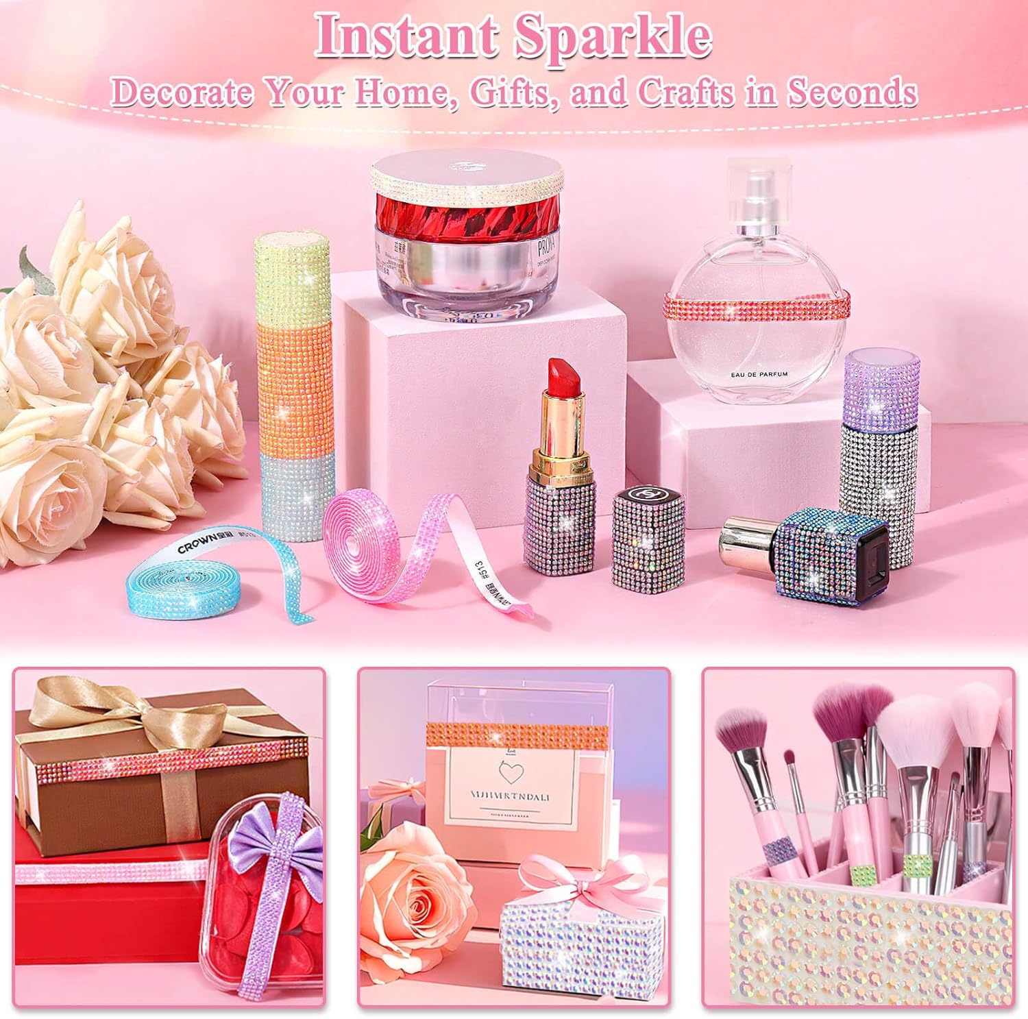 - 【Easy to Use】Simply cut the rhinestone tape to your desired length, peel off the backing of the rhinestone ribbon roll, and press the bedazzle strips onto any surface for an instant sparkling decoration