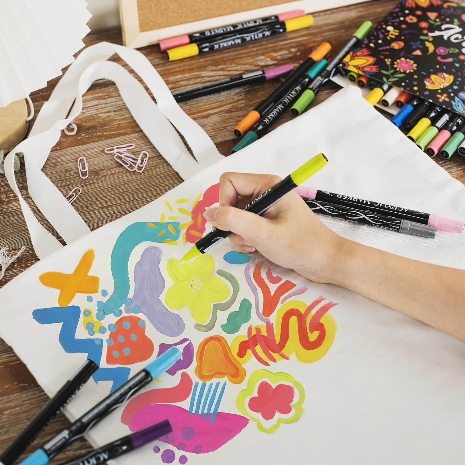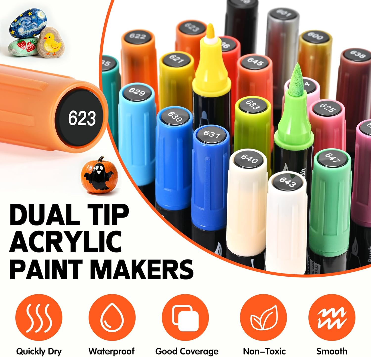 24 Colors Dual Tip Acrylic Paint Markers, Acrylic Paint Pens with Fine Tip and Brush Tip for Rock Painting, Wood, Plastic, Glass, Canvas, Fabric, Pumpkin, DIY Crafts Making Art Supplies