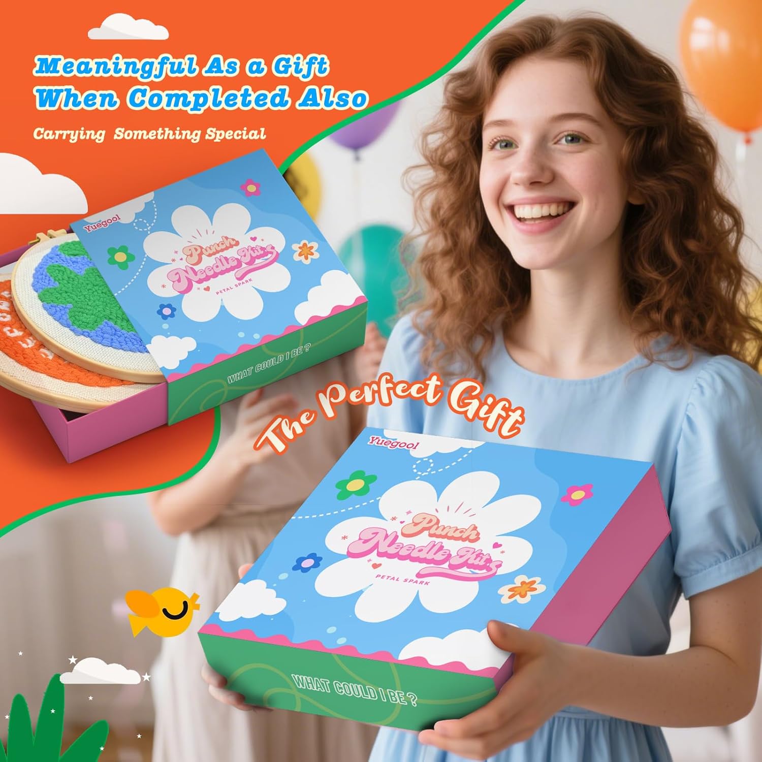 - High-Quality Materials & Abundant Accessories: This punch needle kit is beautifully packaged in a gift unique-designed box . The kit includes: 2 patterned cloths, 2 embroidery hoop, 2 Bracket, 6 punch needle tools, and an ample supply of embroidery yarn threads. Everything you need to create beautiful crafts