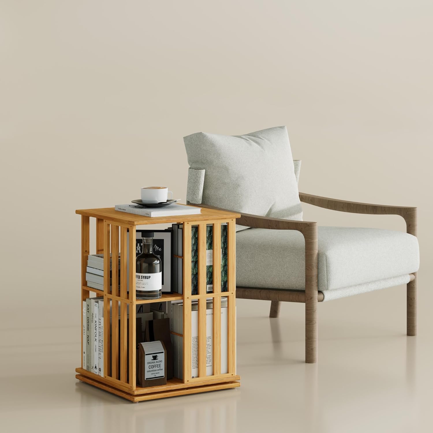 YOWOS Rotating Bookshelf Tower, 360 Display Spinning Bookcase, Bamboo Bookshelf Floor Standing Storage Rack, Wood Narrow Book Shelf Organizer for Kids&Adults (Nature, 2 Tier)