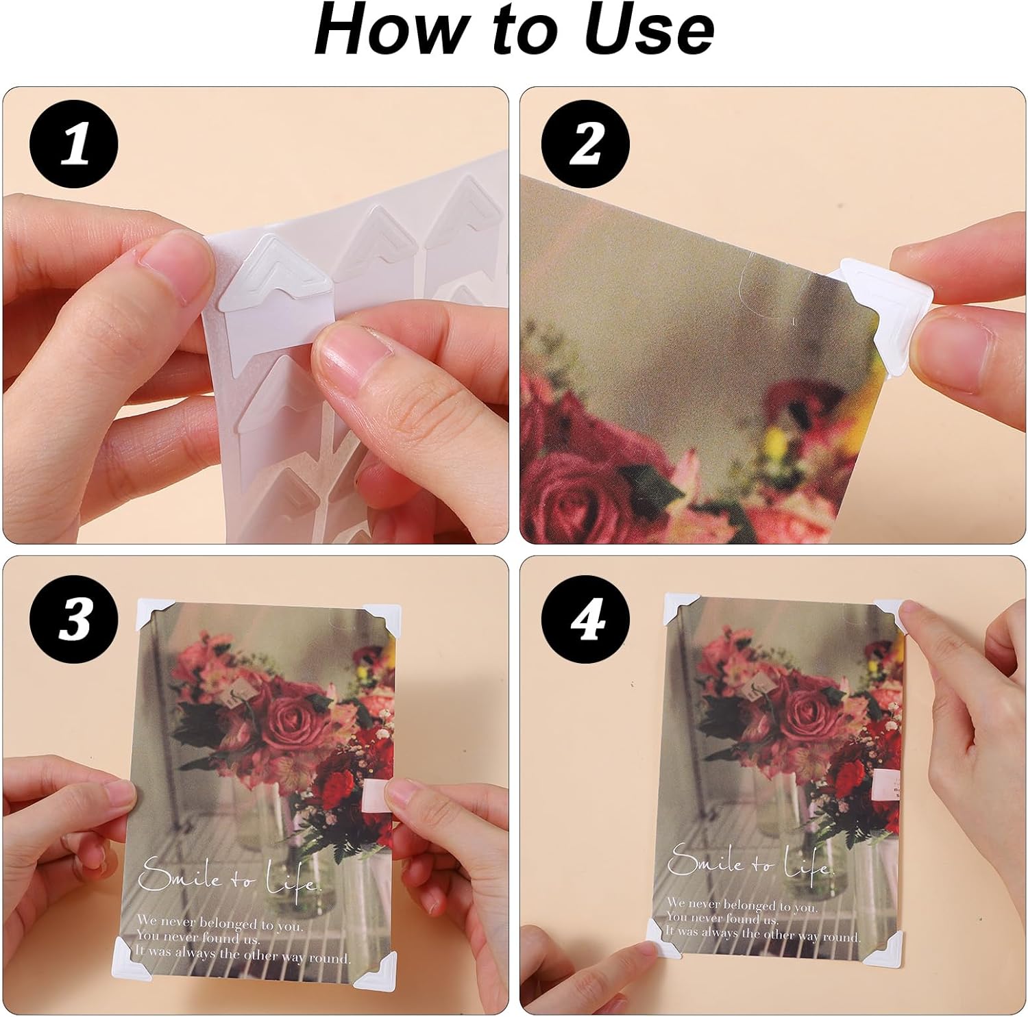 - 【Easy to Use】 The picture corners for scrapbooking are self-adhesive. When using, you only need to tear them off and paste, without additional glue. Put the corner of the photo into the scrapbook photo corners and then fix it to the target position