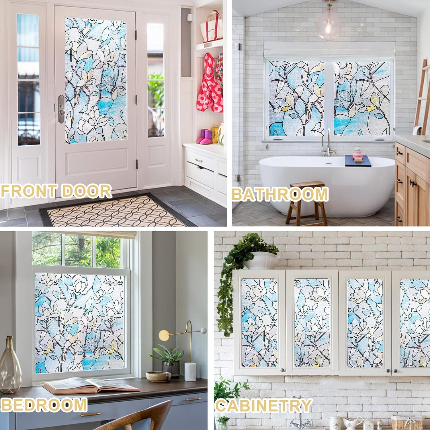 - Floral Blue Elegance-The Magnolia Stained Glass Window Privacy Film showcases delicate magnolia flowers with soft, pastel - toned petals against a dreamy blue backdrop. Its stained - glass - style depiction creates an elegant, tranquil ambiance, transforming windows into a piece of botanical art that adds a touch of natural beauty to any room.