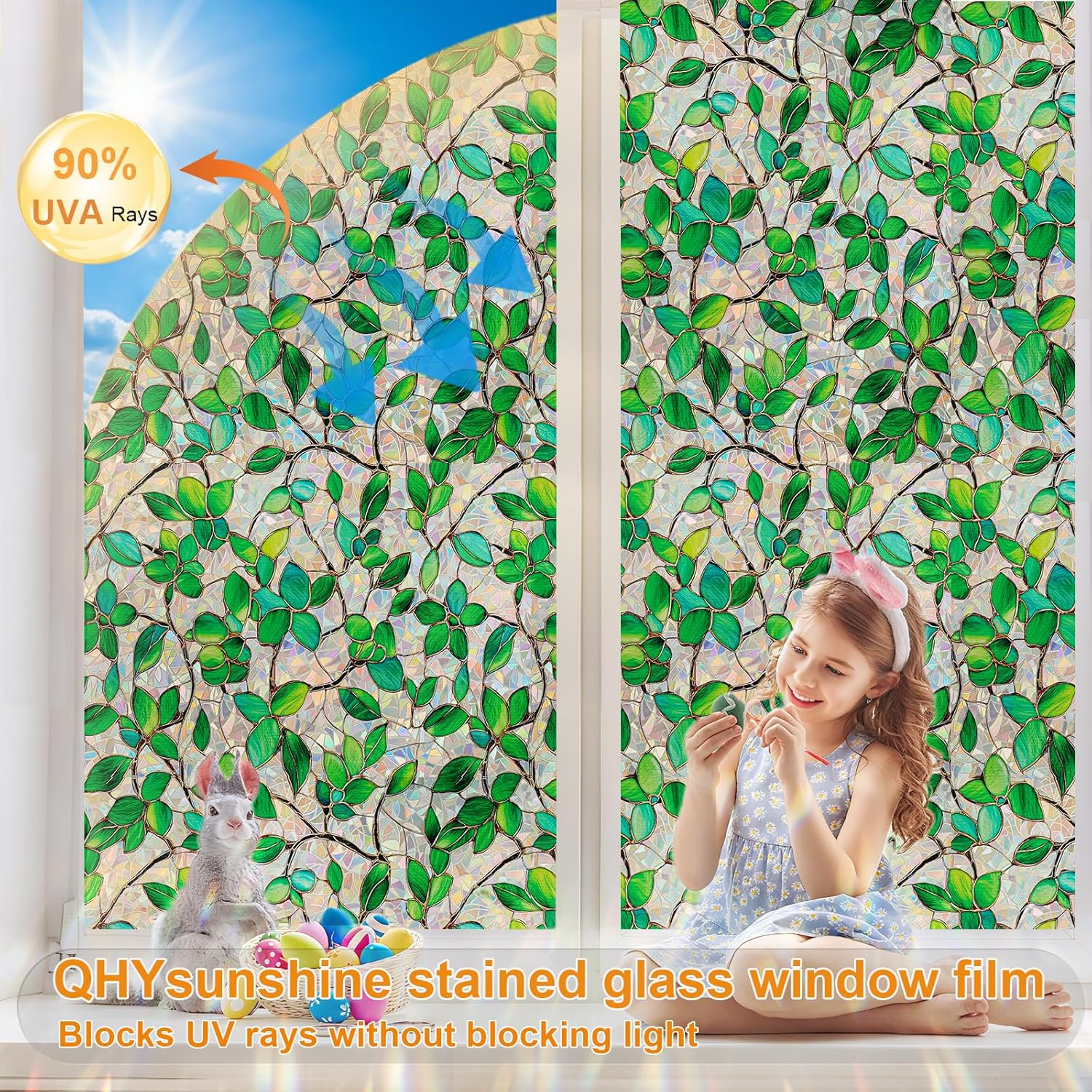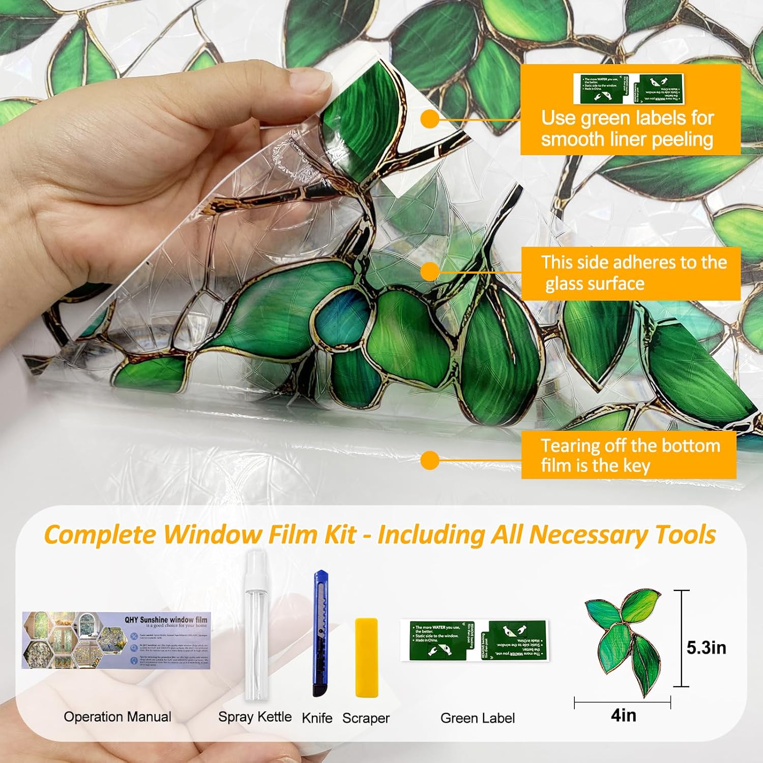 - DECORATIVE DESIGN: These window films feature a beautiful green leaf pattern that adds a natural freshness to any room and creates a rainbow visual effect when the sun shines.