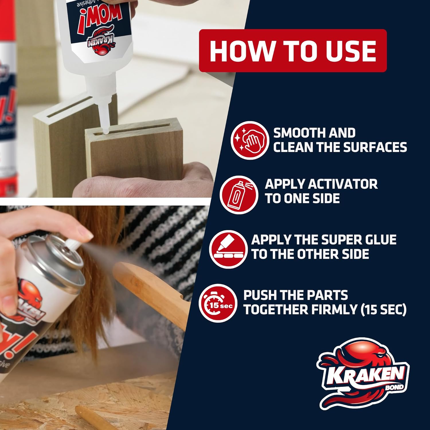 Kraken Bond Wow! CA Glue Set (4x3.5 oz) with Activator (2x13.5 oz) –Super Fast Cyanoacrylate Adhesive Kit for Wood, Plastic, Ceramic, Craft -DIY Repair –4 X Ext. Bottles & 10X Nozzles Inc. 2 Pack