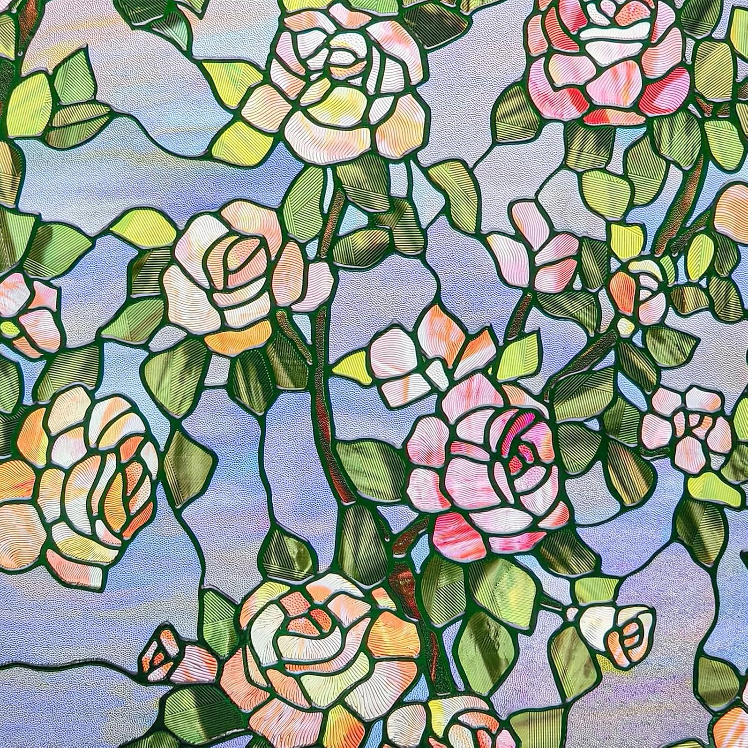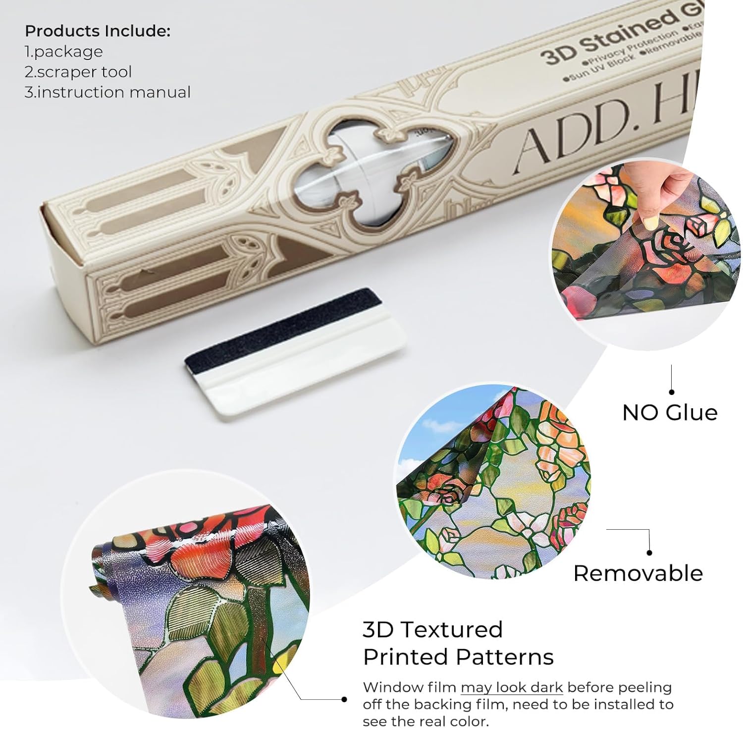 - Easy Installation and Adhesive-Free0 -Our stain glass film installs easily, no glue needed. Just measure, cut, and apply with water on clean glass. It's residue-free for easy repositioning or removal whenever you want a new look.